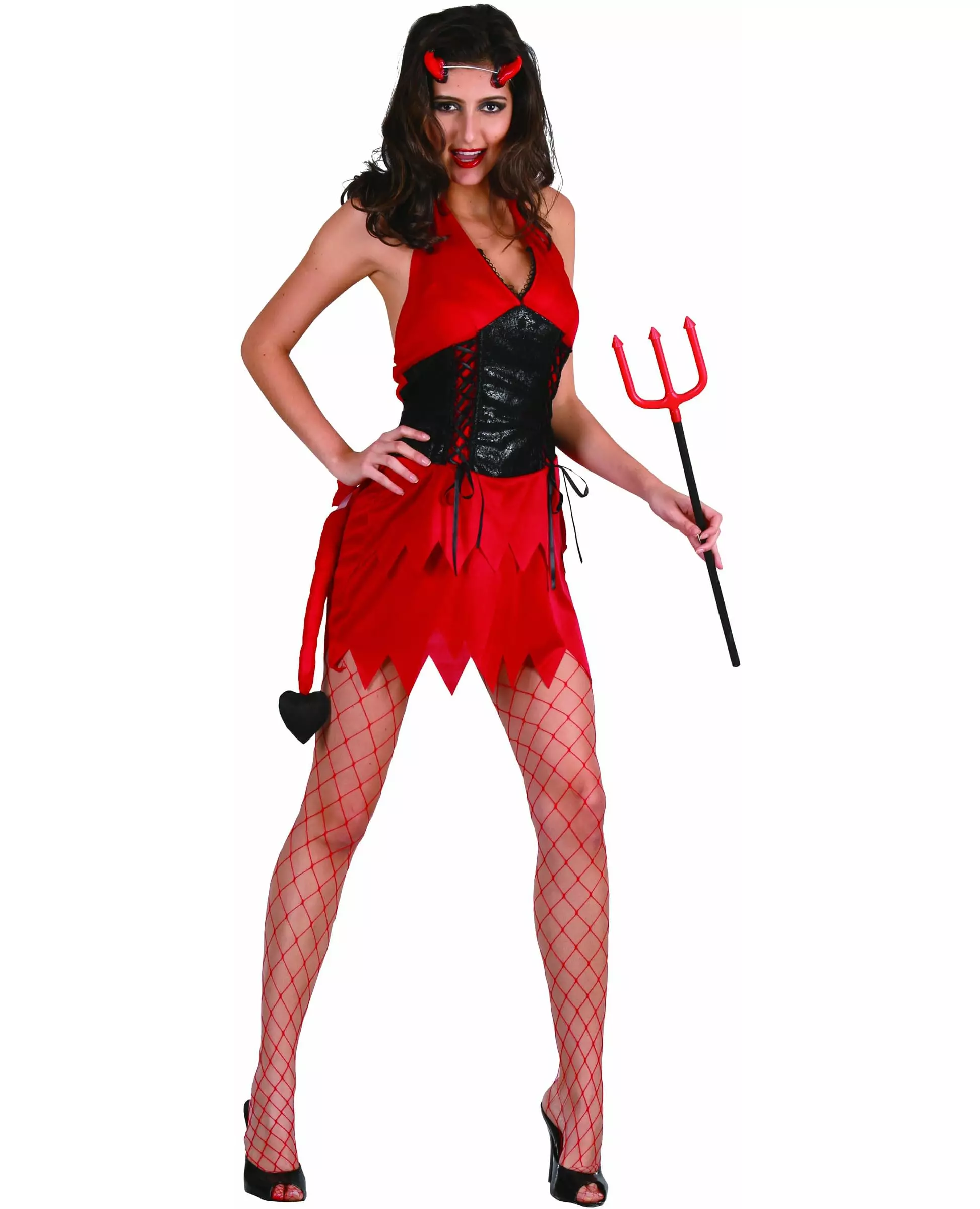 Bli en sann elskerinne i Helvete! Dette djevelkostymet for kvinner består av en kjole, horn og en hale (kunstnegler, høygaffel, strømpebukser og sko er ikke inkludert). Den korte kjolen er rød og kuttet i spisser nederst. En falsk svart overdel er plassert foran på kjolen og gir et sexy og feminint preg. En rød hale er også plassert med borrelås. Den har en svart hjerteformet tupp. Til slutt vil to røde horn montert på en strikk gjøre deg til en ekte djevel. Dette kostymet vil være perfekt for å legemliggjøre en sexy djevel på Halloween eller en fest med skrekktema. Inkludert tilbehør: Kjole Horn Hale Materiale: 100 % polyester Pleie: Håndvask