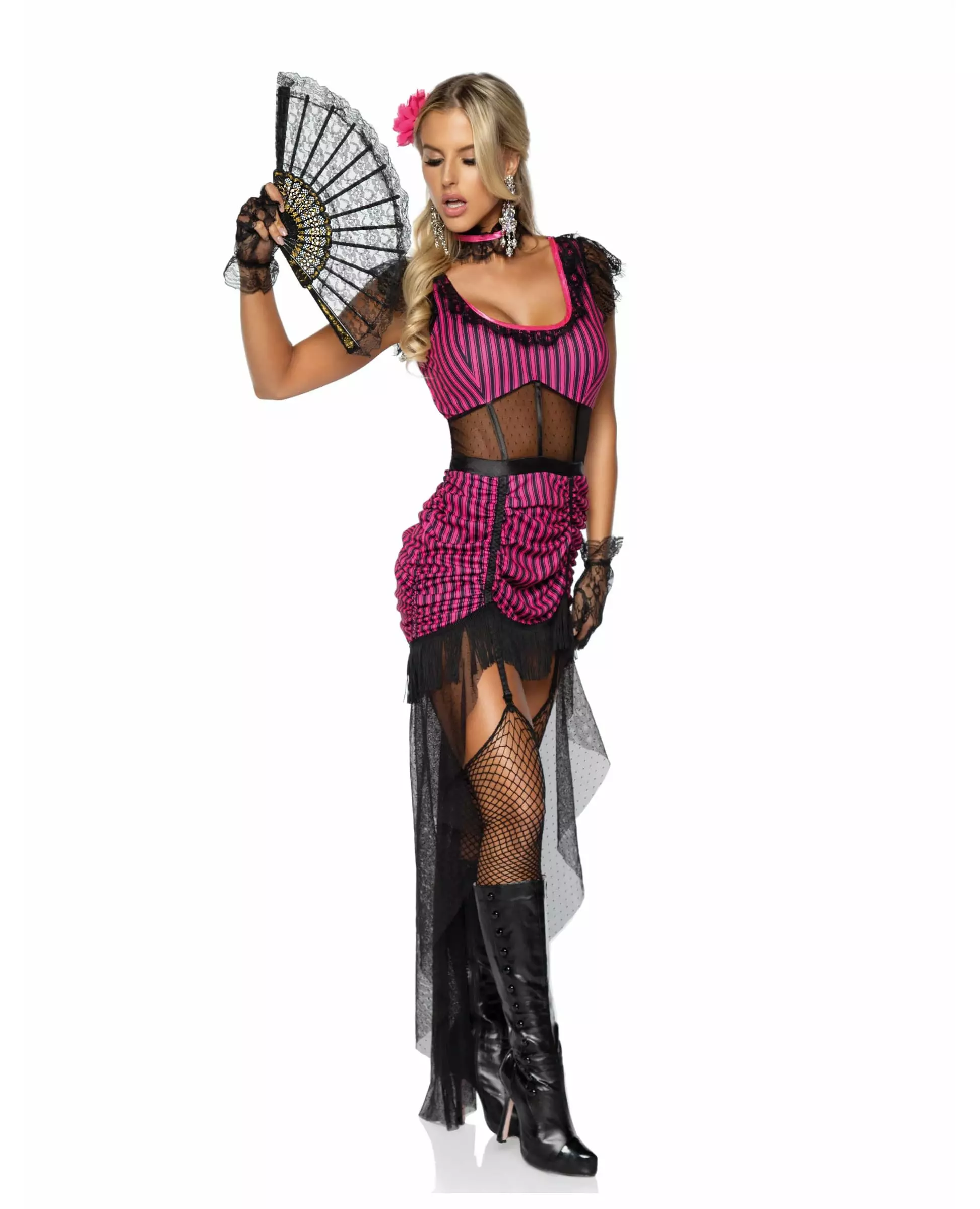 Legemliggjør en av de vakreste kvinnene fra Ville Vesten. Dette sexy saloonjente-kostymet for kvinner inkluderer en kjole, en choker, en hårspenne og et strømpebånd (vifte, hansker og smykker er ikke inkludert). Kjolen er laget av rosa og svart vertikalt stripete stoff. Et svart, gjennomsiktig slør er plassert på magen foran for å gi kjolen karakter. Svart imitert blonde faller på skuldrene så vel som nederst på kjolen. Bak på kjolen er et langt, svart, gjennomsiktig slør pyntet opp dette rynkede skjørtet. Et strømpebånd med blonder er også på plass. En svart imitert blondechoker med et rosa satengbånd gir antrekket sjarm. Til slutt skal en hårspenne med en rosa stoffblomst plasseres i håret. Dette komplette og høykvalitets saloondanser-kostymet vil være perfekt for ditt western-tema kostymefest. Inkludert tilbehør: Klips Halsbånd Strømpebånd Kjole Materiale: 100 % polyester Vedlikehold: Håndvask