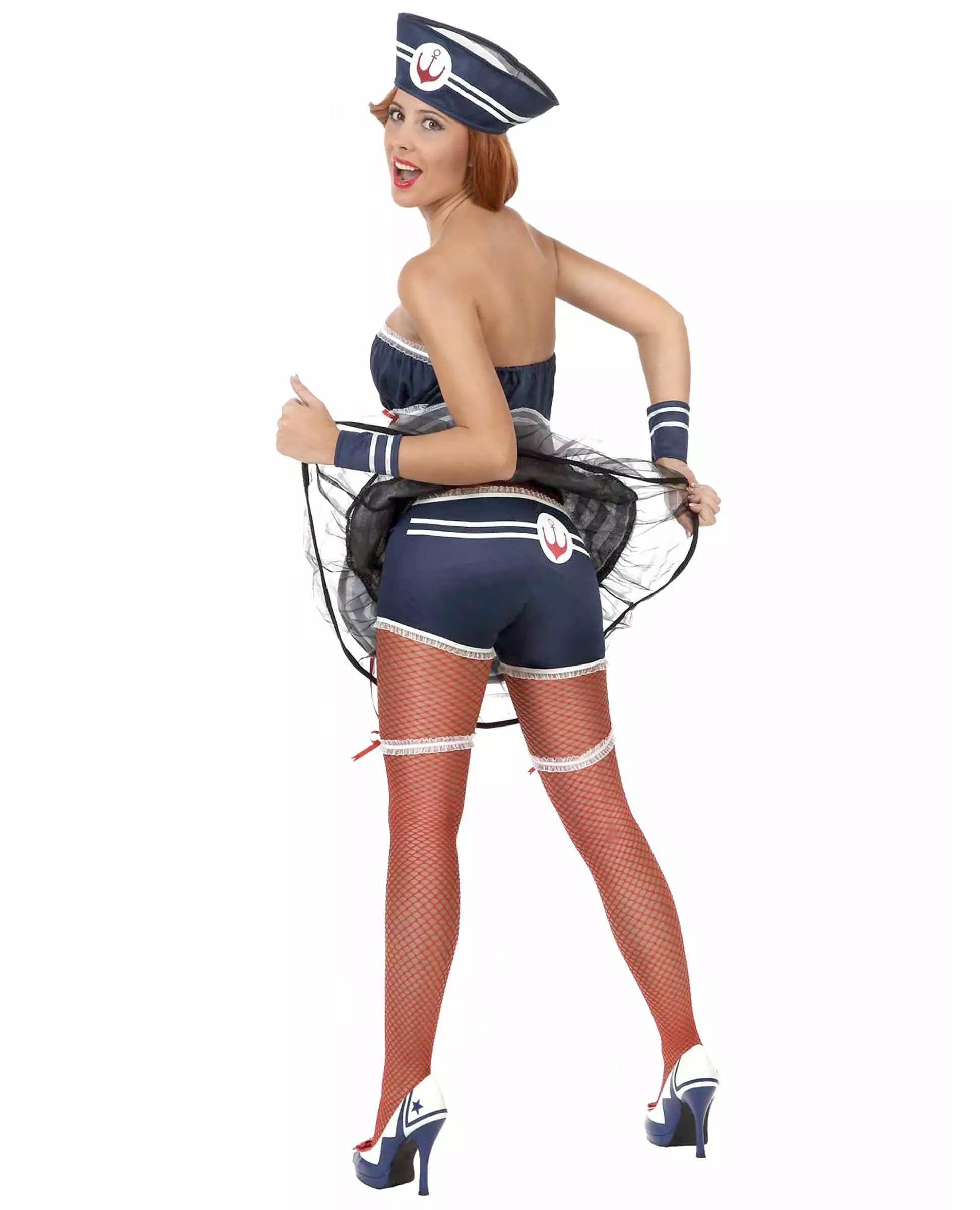 Komplett kostyme! Dette sexy sjømannskostymet for kvinner består av en kjole, strømpeholdere, shorts, hodeplagg og armbånd (sko og strømper er ikke inkludert). Den stroppeløse kjolen er blå og hvit. Blondekanter er på endene, og et underskjørt er sydd fast. Bånd er på baksiden, slik at du kan justere antrekket til kroppsfasongen din. De små blå shortsene matcher og har et anker trykt på baksiden. Et hodeplagg, hvite strømpeholdere og armbånd kompletterer dette settet. Dette kostymet vil være ideelt for utkledning eller temafester. Materiale: 100 % POLYESTER Vedlikehold: Håndvaskbar
