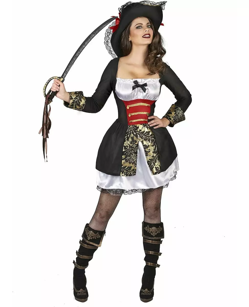 Bli med på et pirateventyr! Dette sexy piratkostymet for kvinner består av en kjole og en hatt (strømpebukser, støvler og sabel er ikke inkludert). Den korte kjolen er tettsittende i midjen og puffer ut fra skjørtet. De lange ermene har mansjetter med barokke gullmønstre som også finnes på underskjørtet. De svarte delene er laget av myk filt, mens de hvite elementene er i sateng. Under skjørtet gir et hvitt filtfôr kantet med svart blonder et snev av eleganse til antrekket. Tips: For enda mer volum til skjørtet anbefaler vi å legge til et ekstra underskjørt (selges separat). Den svarte hatten med blondekant og dekorert med små røde satengsløyfer passer til hodeomkretser på opptil 60 cm. Skummaterialet vil sikre optimal støtte. For en kostymefest vil du definitivt være den mest overbevisende med dette sexy piratkostymet!. Inkludert tilbehør: Dresshatt Materiale: 100 % polyester Stell: Håndvaskbar Målinformasjon: For størrelse S er kjolen omtrent 85 cm lang