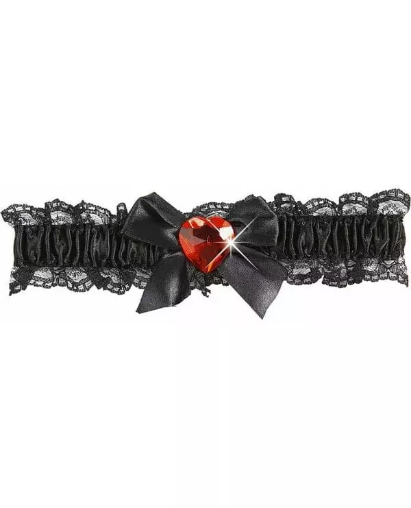 Spill det sexy kortet til Valentinsdagen Dette sexy strømpebåndet for kvinner er svart. Det har en vakker satengeffekt og er kantet med svart blonde. For ekstra komfort er det elastisk. En svart satengsløyfe med et rødt plasthjerte pryder dette pene strømpebåndet. Dette tilbehøret vil være perfekt for å gi et sexy preg til antrekket ditt til Valentinsdagen. «Copyright Widmann SRL». «Copyright Widmann SRL. Inkludert tilbehør: Strømpebånd
