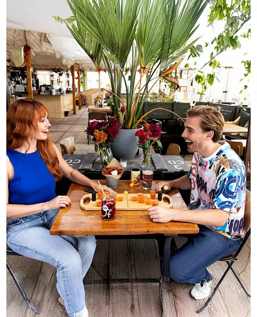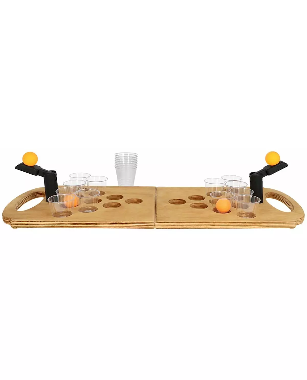 Sikt, skyt og drikk! En god atmosfære er garantert med dette Shot Pong-drikkespillet, den vanvittige miniversjonen av beer pong ... i skytemodus! Det består av et sammenleggbart trebrett, enkelt å transportere og sette opp, 2 fjærbelastede utskytere, 4 baller og 12 shotglass som skal plasseres på de angitte stedene. Prinsippet er enkelt: plasser glassene dine, juster skuddet ditt med utskyteren, og prøv å treffe motstanderens mål. For hvert vellykket skudd drikker motstanderen! Perfekt for å live opp en bursdag, en kveld med venner eller et utdrikningslag, dette spillet lover spill fulle av latter og vendinger. Tilbehør inkludert: 1 sammenleggbart brett 2 utskytere 4 baller 12 shotglass