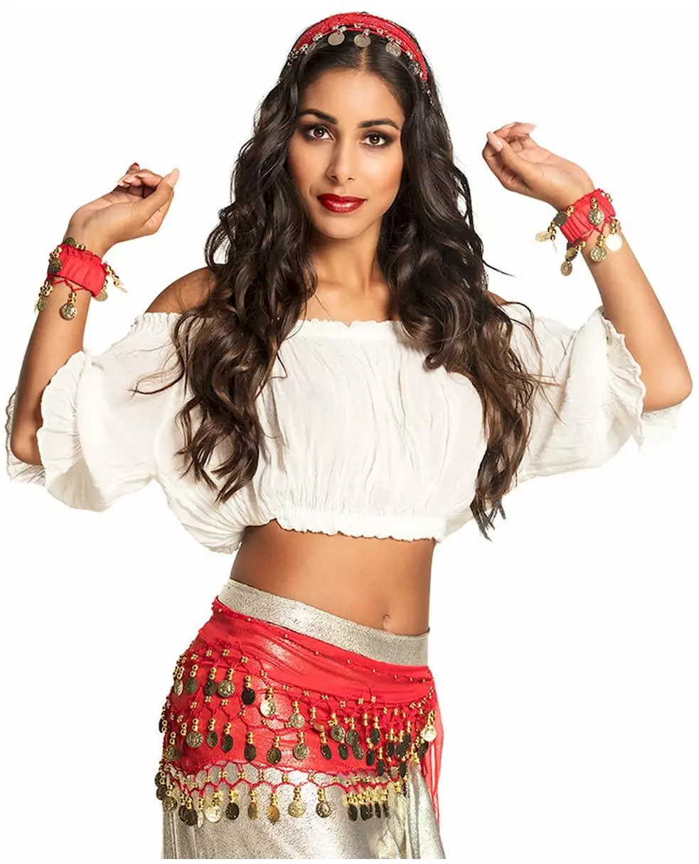 Gå inn i Esmeraldas sko til karnevalet Dette sigøynerdraktsettet for kvinner består av et pannebånd, armbånd og et belte (topp og skjørt er ikke inkludert). Tilbehøret som utgjør dette settet er laget av rødt stoff med små gullbiter. Det vil være perfekt for å fullføre sigøynerkostymet ditt til karnevalet. Inkludert tilbehør: Pannebånd Armbånd Belte Materiale: 100 % polyesterstoff Vedlikehold: Håndvask
