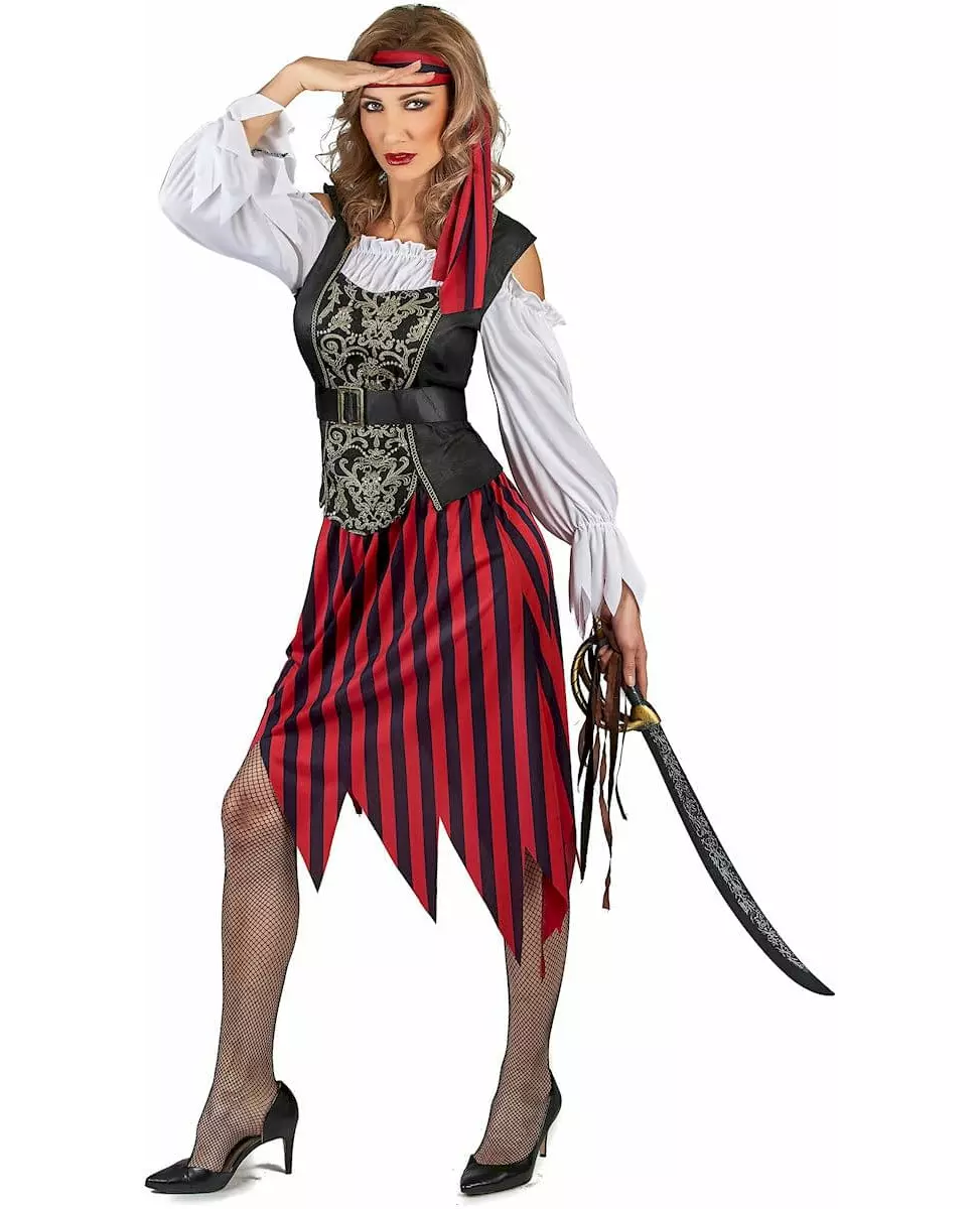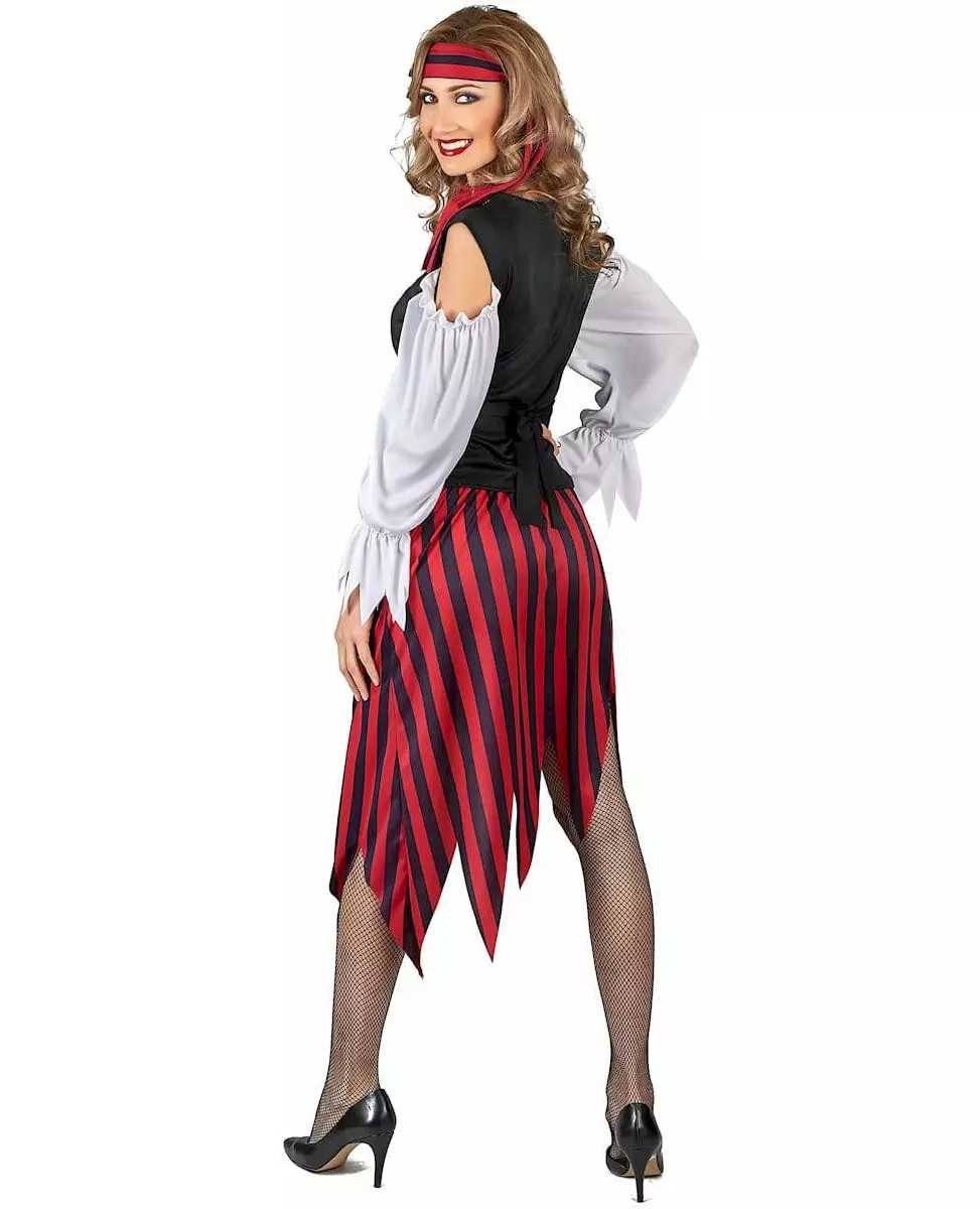 En ekte pirat! Dette piratkostymet for kvinner inkluderer en topp, et skjørt, et belte og et pannebånd (strømpebukser, sabel og sko er ikke inkludert). Toppen inkluderer et korsett med skinnende gullmønstre og en hvit elastisk bluse med puffermer. Hele settet er ett sett. Midjen strammes med et svart filtbelte med en plastspenne som knytes bak. Skjørtet med elastisk linning er stripete i svart og rødt. Nederdelen er kuttet i spisser og på skrå for å gi en revet effekt. Pannebåndet er også stripete i svart og rødt. Det knytes rundt hodet og fullfører dette sigøynerpiratkostymet perfekt. Det vil være ideelt for en pirattemafest eller et show! Du vil bli en sensasjon! Inkludert tilbehør: Topp Skjørt Belte Pannebånd Materiale: 100 % polyester Vedlikehold: Håndvaskbar