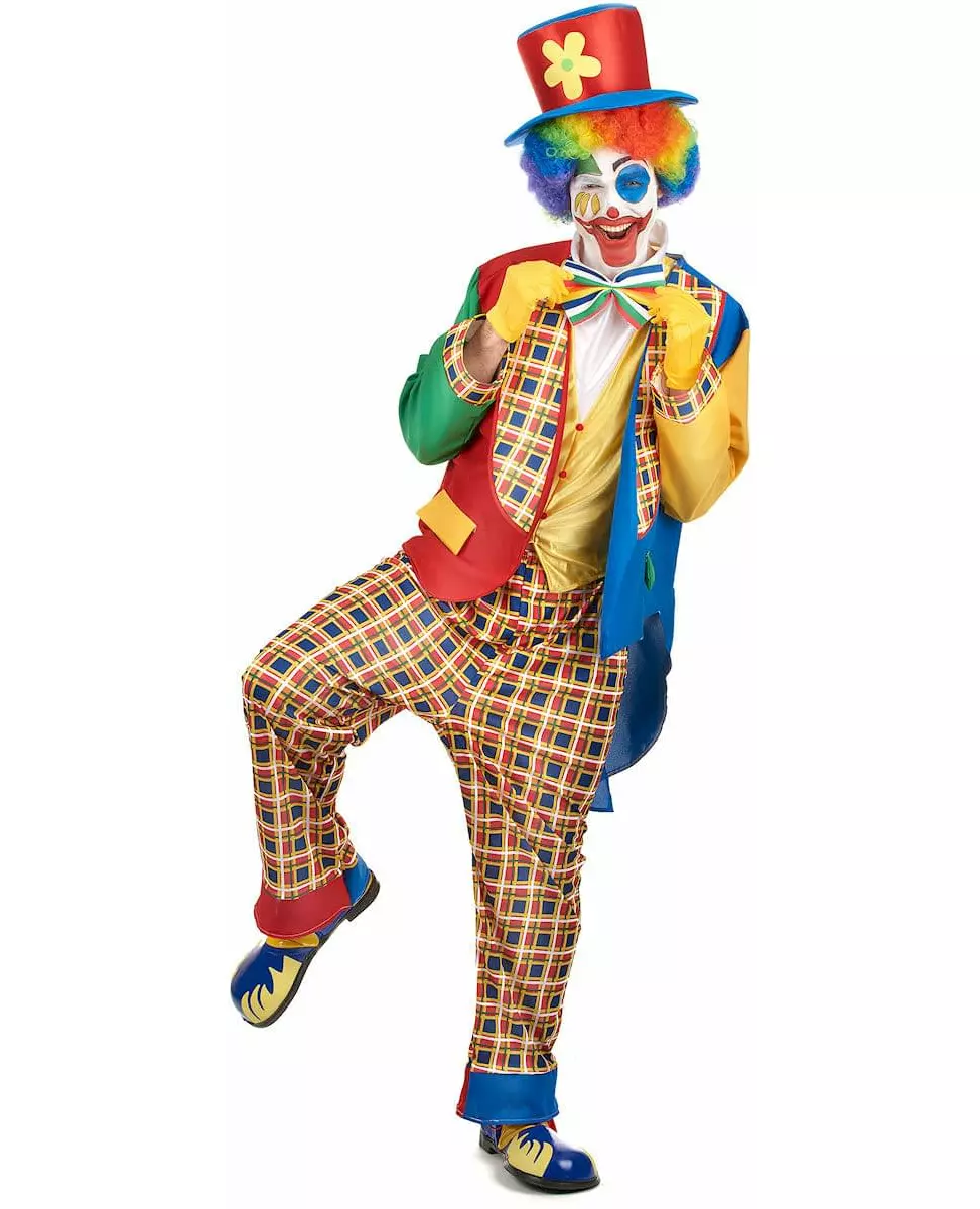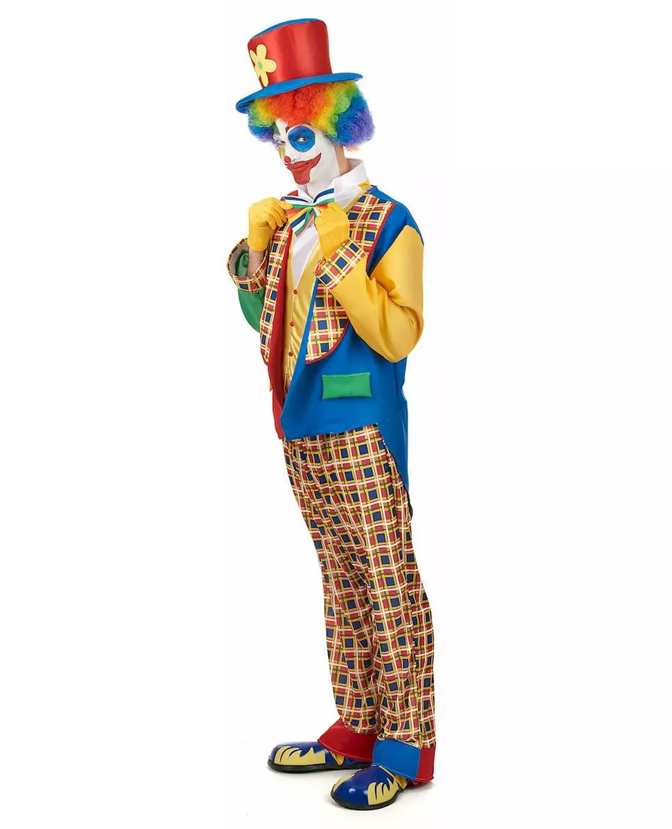 Det perfekte klovnekostymet til karneval. Dette klovnekostymet er for menn og består av en hatt, en jakke, en topp og bukser. (Sko, parykk og hansker er ikke inkludert). Hatten er laget av mykt skum dekket av tykt rødt og blått stoff, og en filtblomst er festet foran. Den passer til hodestørrelser rundt 60 cm. Jakken er en frakk og består av flere forskjellige fargede og trykte deler. Lommene er falske. Toppen er en falsk gul satengvest. Den er ermeløs og festes bak med borrelås bak nakken. Den faste flerfargede sløyfen vil fullføre antrekket perfekt. Buksene tar opp trykket av jakkens falske slag. Den er vid, noe som ikke vil unnlate å gi kostymet en komisk dimensjon. Den har en elastisk midje og vil være veldig behagelig å ha på seg. Bli dagens liv med dette prangende fargede kostymet til en bursdag eller til karneval!. Inkludert tilbehør: Bukser Topp Sløyfe Jakke Hatt Materiale: 100 % polyester Vedlikehold: Håndvask