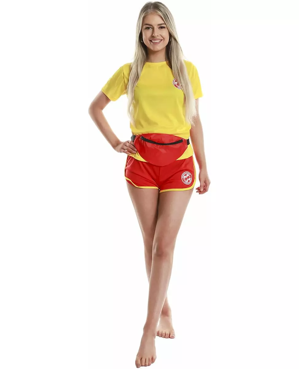 Bassengfest-alarm! Dette badevaktkostymet er for kvinner. Det inkluderer en topp, shorts og en magetaske. Toppen er en gul t-skjorte med en rød badevaktlogo trykt på brystet. Shortsen er rød med gul kant. Den inkluderer også en hvit badevaktlogo. Magetassen er rød og lukkes med en svart glidelås. Ideelt for et lett kostyme på en bassengfest eller en utkledningsfest, velg dette badevaktkostymet! Inkludert tilbehør: Topp Shorts Magetaske Materiale: 100 % polyester Vedlikehold: Håndvask