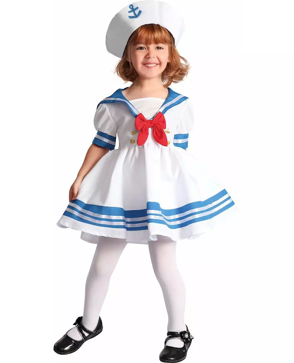 Åh hei sjømann! Dette sjømannskostymet for jenter inkluderer en kjole og en hatt. Kjolen er hvit med blå striper på de korte ermene og nederst på skjørtet for å skape en ekte sjømannsstil! Hatten er hvit og imiterer de som brukes av sjømenn. Et blått båtanker er trykt i midten. Dette sjømannskostymet vil være perfekt til en kostymefest eller et karneval! Inkludert tilbehør: Kleslue Materiale: Polyester Stell: Håndvask
