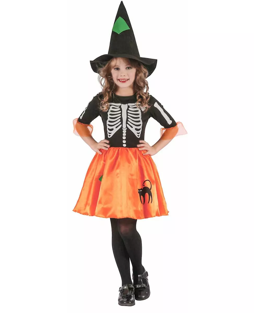 En pen heks til Halloween Dette skjelettheksekostymet for jenter består av en kjole og en hatt (strømpebukser og sko er ikke inkludert). Kjolens overdel er svart med et hvitt skjeletttrykk foran. Nederdelen av ermene er dekorert med et oransje slør. Nederdelen av kjolen er satengoransje og er trykt med en katt og en grønn firkant. Kjolen lukkes bak med borrelås. Heksehatten er svart i et filtstoff. Den er trykt med en grønn firkant. Dette heksekostymet vil være perfekt til Halloween-kvelden. Inkludert tilbehør: Kjolehatt Materiale: 100 % polyester Stell: Håndvask Målinformasjon: For en størrelse 3/4 år (XS), kjolen er omtrent 52 cm lang