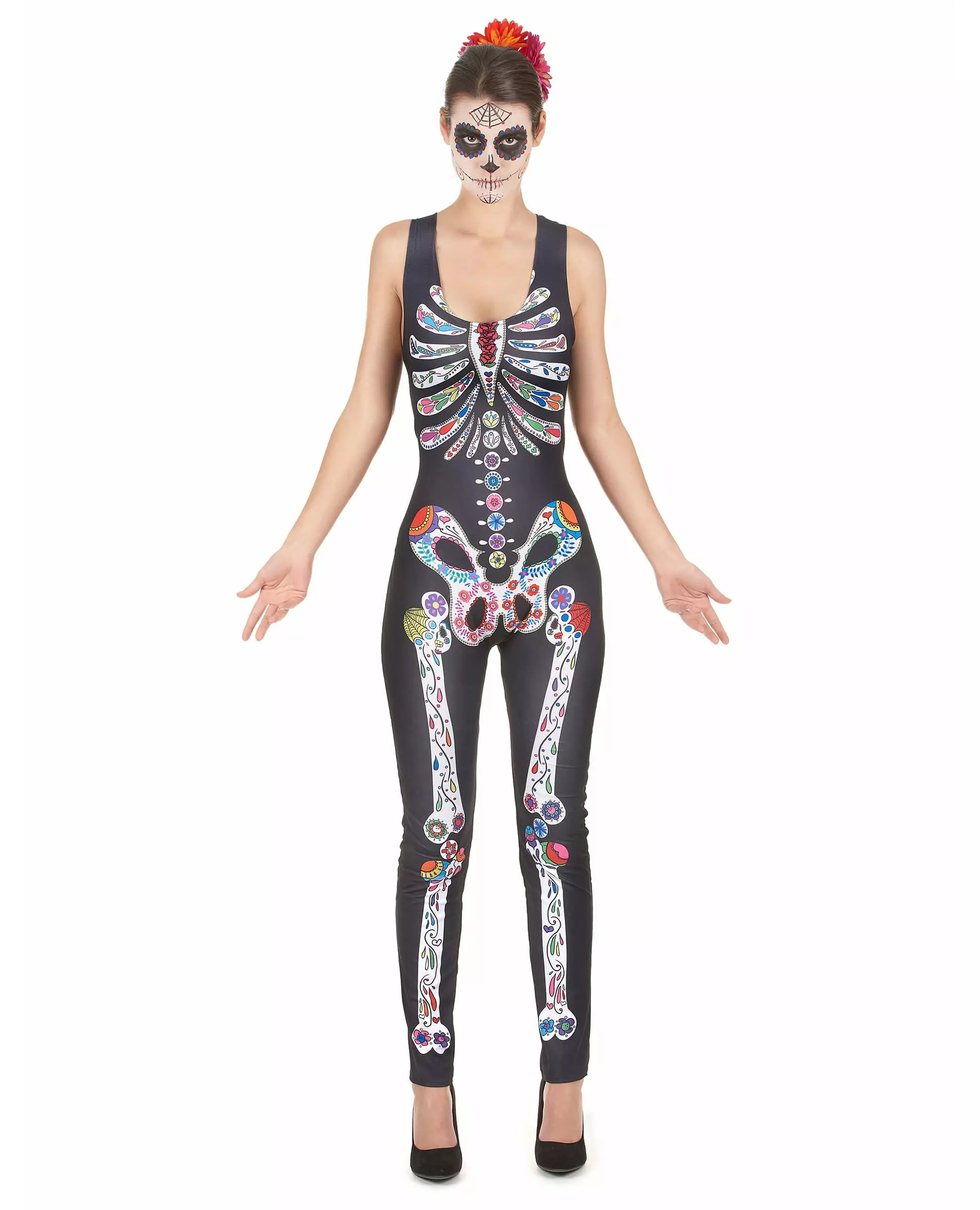 Jumpsuit! Dette Dia De Los Muertos-kostymet er for kvinner og består av en svart jumpsuit. (Blomster og sko er ikke inkludert) Jumpsuiten er ermeløs og tas på som bukser. På forsiden av antrekket er det et trykk som forestiller et fargerikt skjelett, flocket. Jumpsuitens stoff er elastisk: den vil være enkel å ha på seg. Komplett med sko og vakker sminke for å være den mest sexy på Halloween. Inkludert tilbehør: Jumpsuit Materiale: 100 % polyester Stell: Håndvaskbar