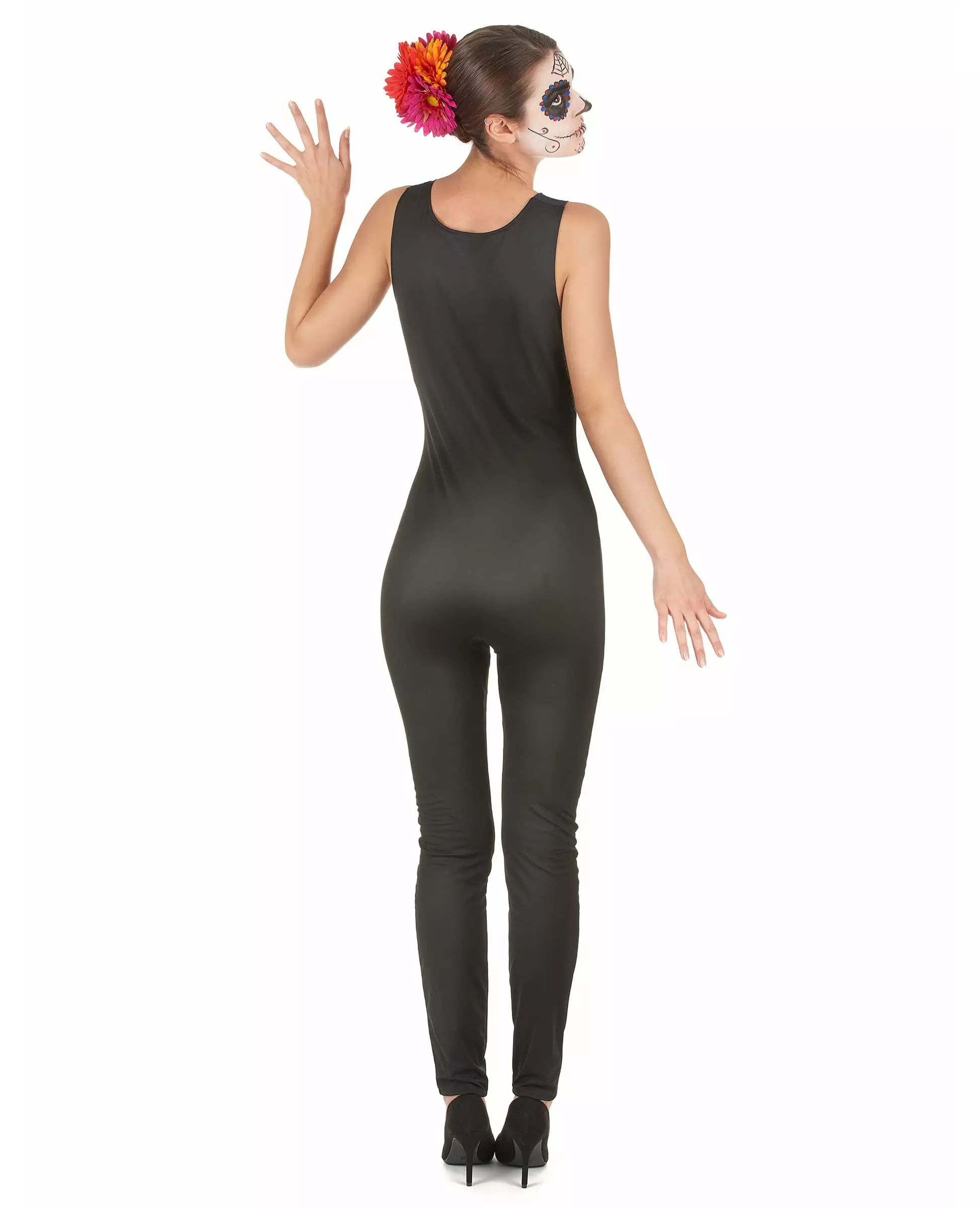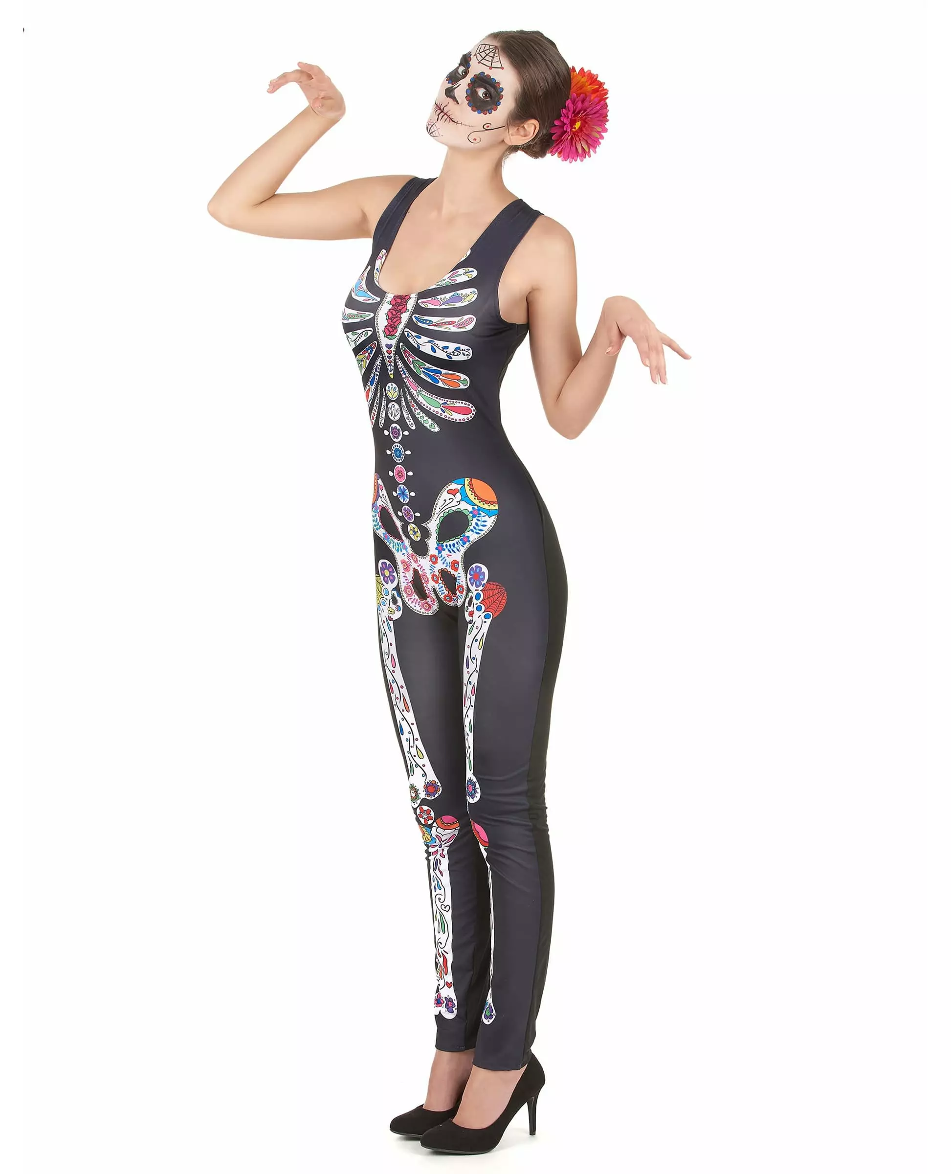 Jumpsuit! Dette Dia De Los Muertos-kostymet er for kvinner og består av en svart jumpsuit. (Blomster og sko er ikke inkludert) Jumpsuiten er ermeløs og tas på som bukser. På forsiden av antrekket er det et trykk som forestiller et fargerikt skjelett, flocket. Jumpsuitens stoff er elastisk: den vil være enkel å ha på seg. Komplett med sko og vakker sminke for å være den mest sexy på Halloween. Inkludert tilbehør: Jumpsuit Materiale: 100 % polyester Stell: Håndvaskbar