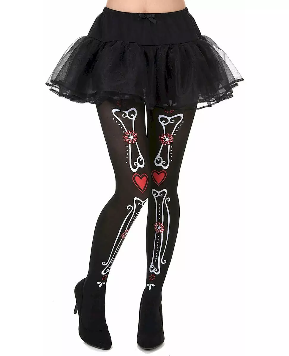 Til de dødes dag Disse fantastiske strømpebuksene i nylon og spandex er svarte og halvgjennomsiktige. De har et vakkert trykk av finurlige bein med røde hjerter i stedet for kneskålene. De vil være perfekte som tilbehør til kostymet ditt på utkledningsfesten din, for eksempel Halloween. Inkludert tilbehør: Strømpebukser Materiale: Nylon og spandex Nylon og elastan Nylon og elastan