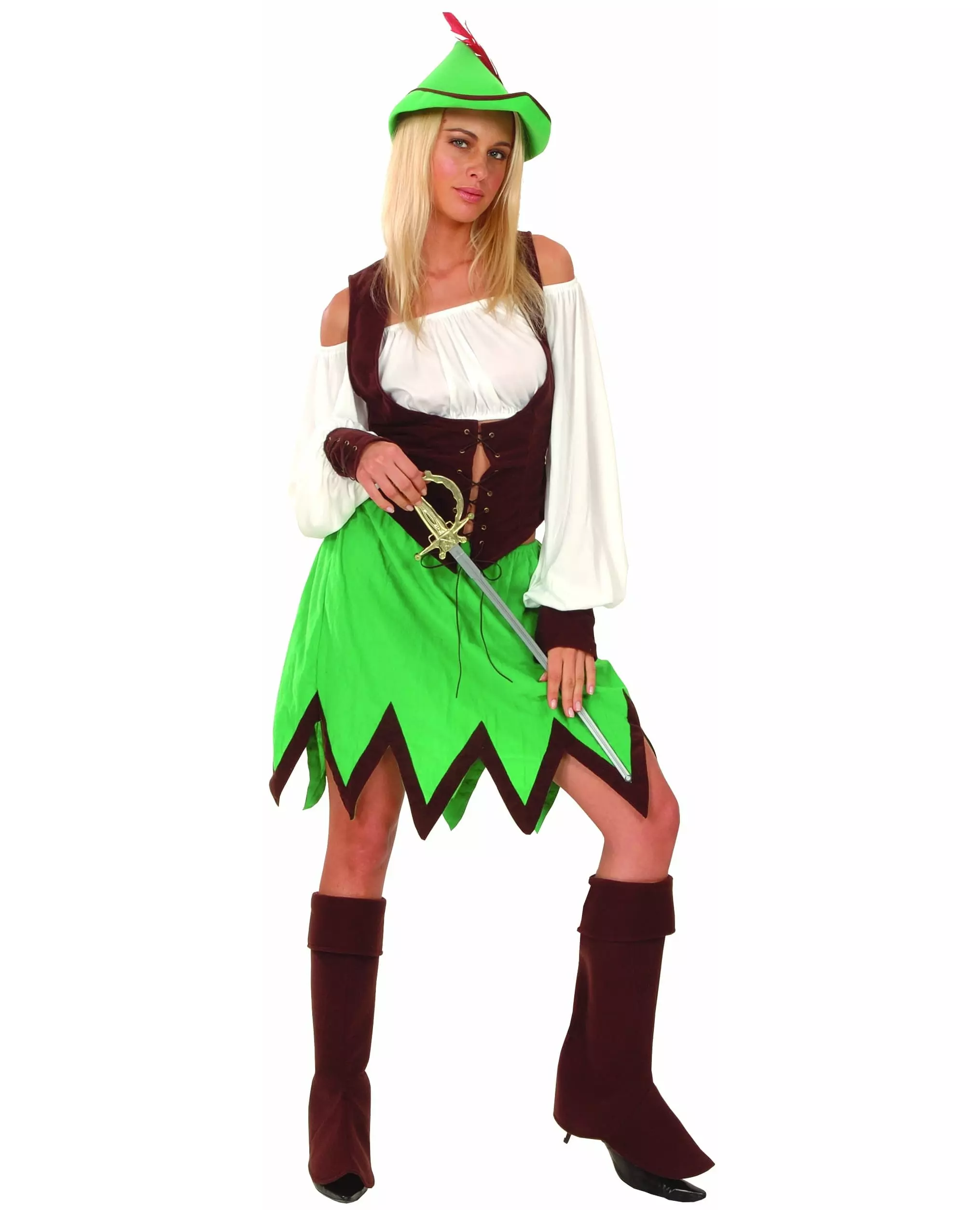 Skogens dronning! Dette skogkvinnekostymet består av en hatt, en brun vest, en topp, et skjørt og et par støveltrekk (snor og sverd er ikke inkludert). Denne hatten, som minner om hatten til en berømt tyv som tok fra de rike for å gi til de fattige, er grønn med en falsk rød fjær. Den hvite bluselignende toppen har en brun vest i imitert dyrehud med snøring i midten. Skjørtet er kuttet til en spiss nederst og er helt grønt (det er ingen brun kant). Det er elastikk i midjen for å tilpasse seg kroppsfasongen din. Støvlettene, i brunt imitert dyrehud, matcher vesten og glir over skoene dine. Dette behagelige antrekket vil være ideelt for et karneval eller til og med eventyr- eller tegneseriefester med venner. Inkludert tilbehør: Skjørt Bolero Hatt Ermer Støvletttrekk Materiale: 100 % polyester Stell: For hånd Målinformasjon: Størrelse M/L: Lengde: 94 cm / bredde: 40 cm Størrelse S: Lengde: 100 cm / bredde: 40 cm