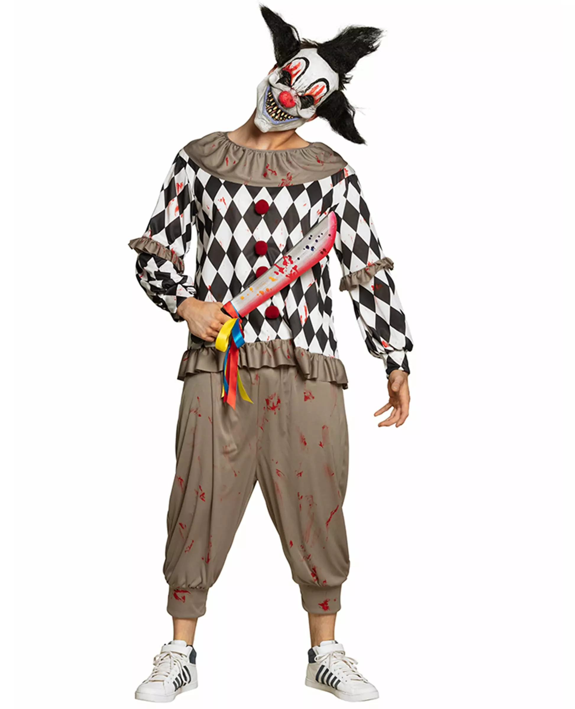Denne Halloween-klovnekostymet ditt kompletteres med denne macheten. Denne klovnemachetten i plast måler omtrent 53 cm i lengden. Den har et svart håndtak og et falskt blodig blad. Fargede bånd er knyttet rundt håndtaket. Denne macheten vil være perfekt for å fullføre ditt demoniske klovnekostyme til Halloween. Inkludert tilbehør: Machete Materiale: Plast, 100 % polyesterstoff