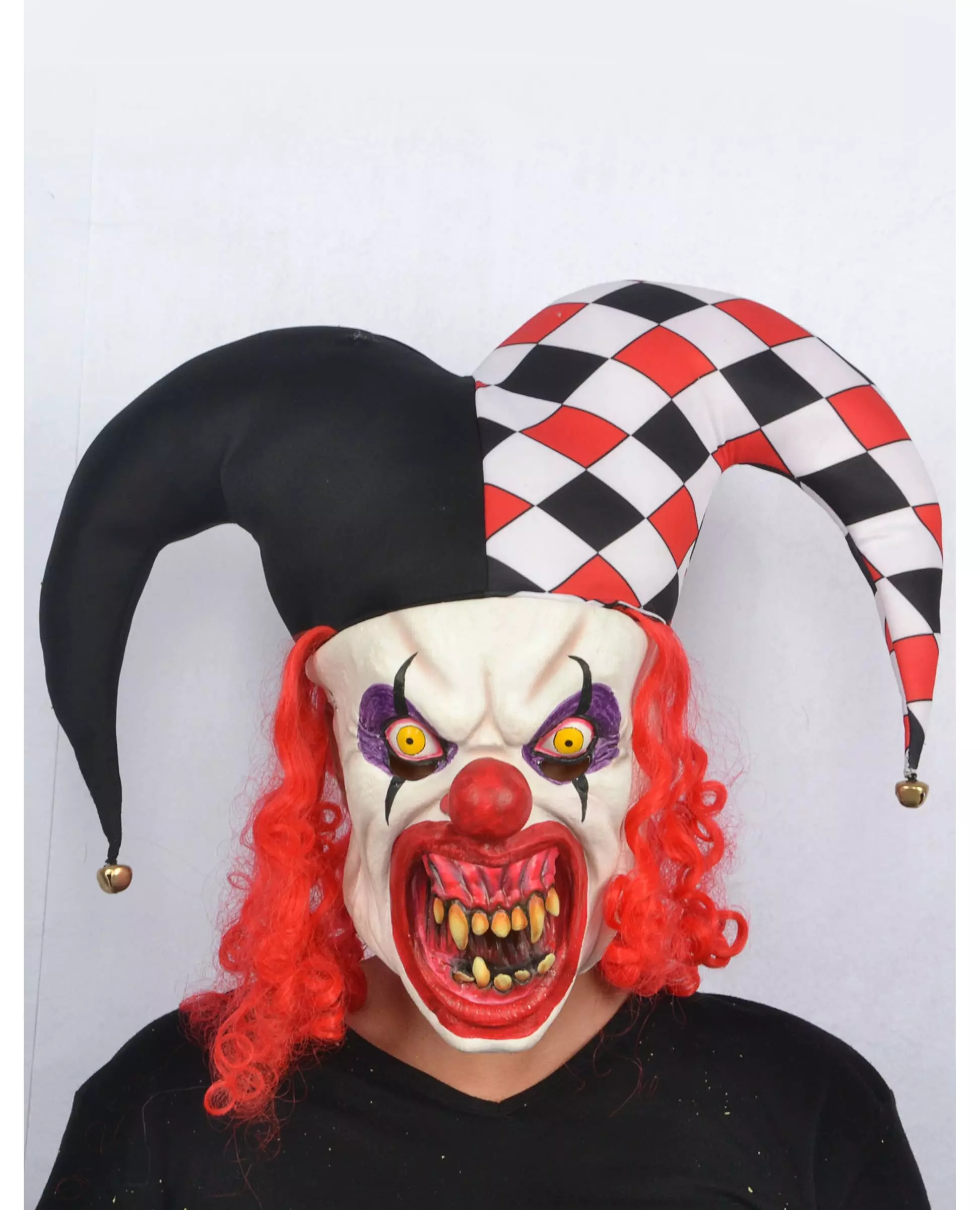 kveld skal du ikke være narren. Denne jokermasken er for voksne. Den er laget av lateks og dekker 3/4 av hodet. Den svarte og røde hatten er integrert i masken med to bjeller i endene. Masken har også litt krøllete rødt syntetisk hår. Den festes til ansiktet ditt med en strikk. Dette skremmende tilbehøret vil være perfekt for å fullføre kostymet ditt på Halloween-kvelden eller til et temaarrangement. Inkludert tilbehør: Maskemateriale: Lateks og syntetisk