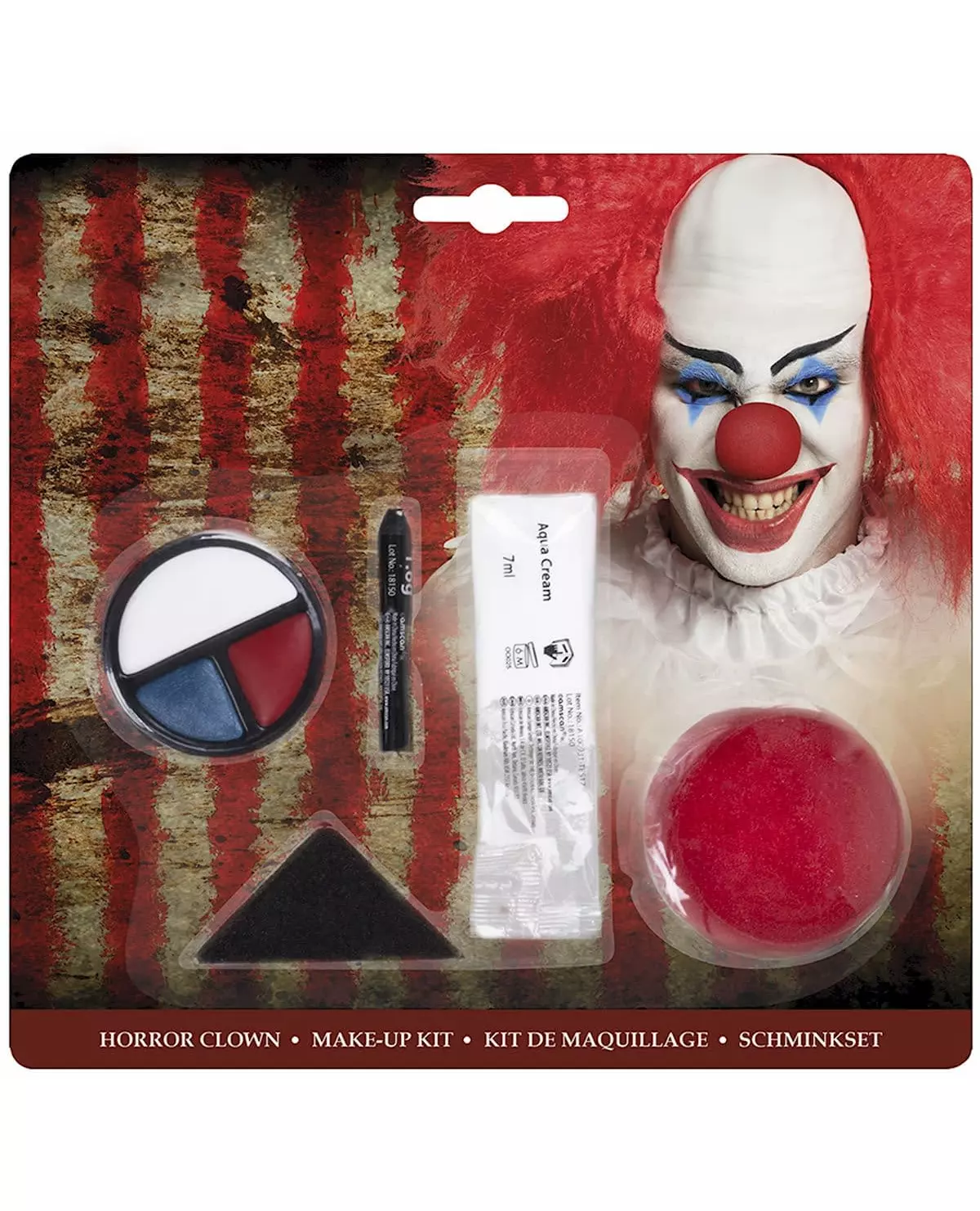 Klovnesminke Dette skumle klovnesettet består av en trefarget ansiktsmaling, en svart blyant, en pose med flytende lateks på omtrent 7 ml, en rød skumnese og en svamp. Med dette komplette sminkesettet kan du lage klovnesminke til Halloween. Inkludert tilbehør: Ansiktsmaling Svart blyant Latekspose Skumnese Svamp