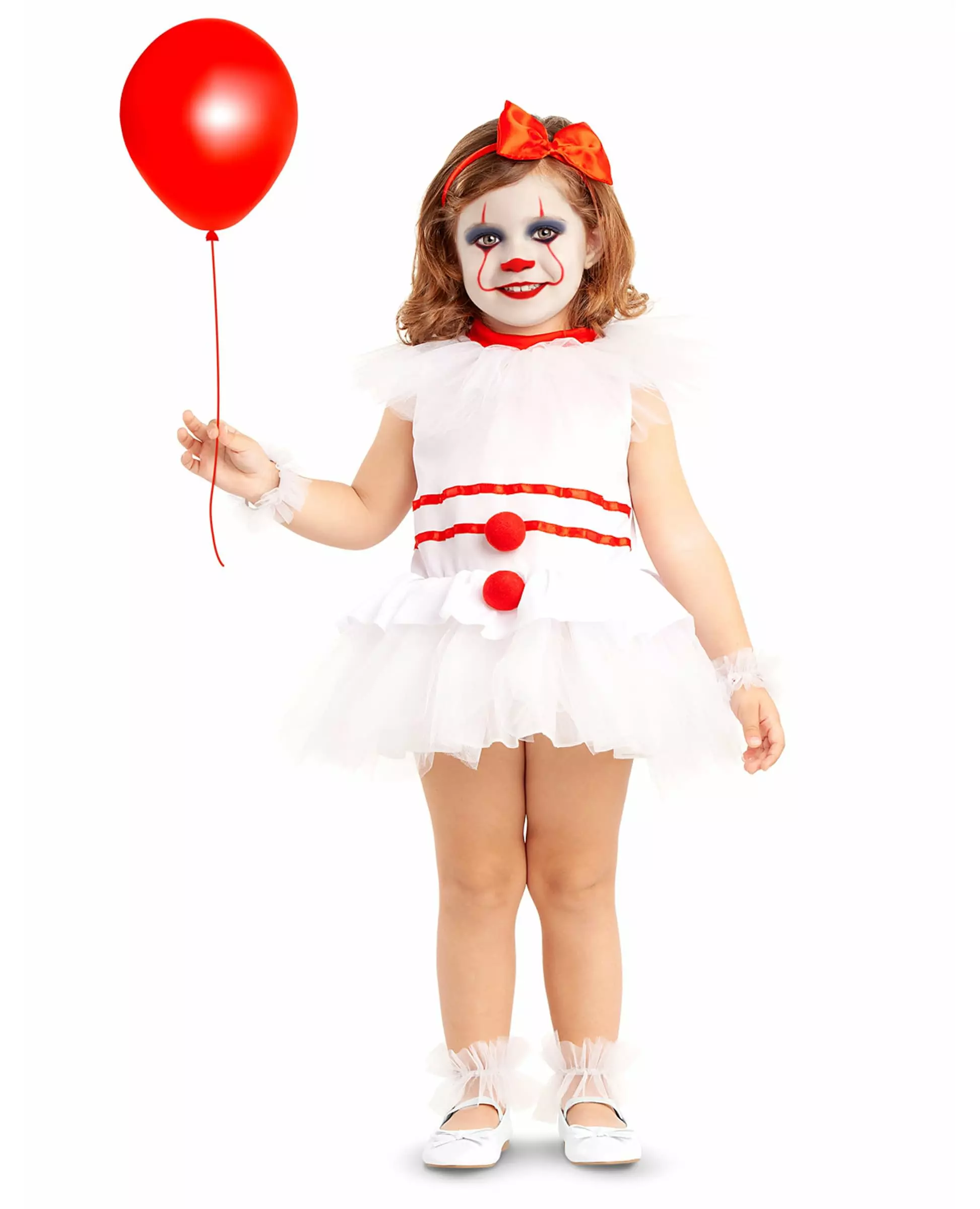 Ikke glem babyens kostyme til Halloween. Dette skumle klovnekostymet for babyer består av en kjole, et pannebånd, en krage, et par armbånd og et par ankelkjeder (sko og ballonger er ikke inkludert). Klovnekjolen er hvit med rysjer nederst. Den er dekorert med pomponger og rød kant. Kragen er i et hvitt jordbærfarget med rød kant. Armbåndene og ankelkjedene er laget av et plissert og elastisk hvitt slør. Til slutt fullfører et pannebånd kostymet. Det er rødt med en sløyfe på siden. Dette kostymet vil være perfekt for å leke de slemme klovnene på Halloween-kvelden. Inkludert tilbehør: Kjole, pannebånd, krage, armbånd, ankelkjeder, materiale: 100 % polyester, pleie: Håndvask