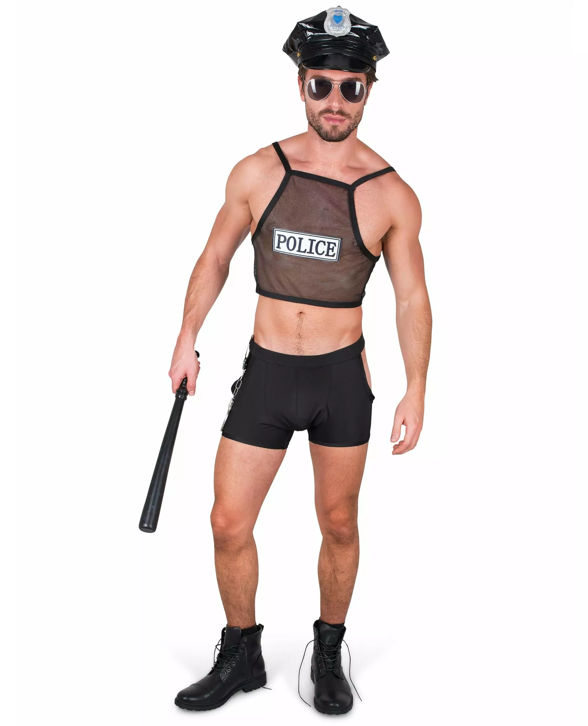 Sexy! Dette politibetjentkostymet består av en topp, shorts og en caps (sko og batong er ikke inkludert). Crop-toppen er en gjennomsiktig svart tanktopp med ordene «Police» skrevet på forsiden. Shortsen er svart med utskjæringer på sidene og et par håndjern trykt på den ene siden. Den svarte capsen er typisk for amerikansk politi og har et merke. Dette herresettet vil gjøre deg til en veldig rampete politibetjent til et kostymefest! . Inkludert tilbehør: Topp Shorts Caps Materiale: 100 % polyester Vedlikehold: Håndvask