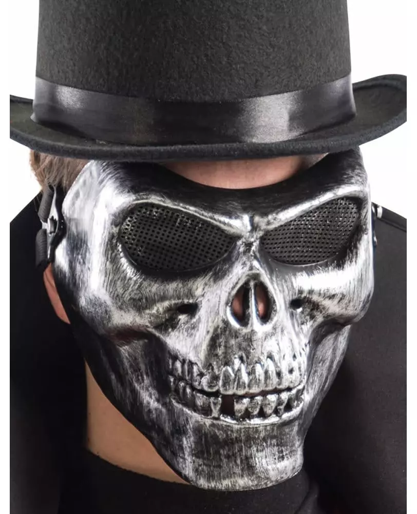 Vis ditt sanne ansikt! Denne halvmasken for voksne forestiller et sølvfarget skjelett. Den måler omtrent 18 cm i bredden og holdes på plass av en dobbel svart strikk. Den er sølvfarget og dekker bare den nedre delen av ansiktet. Laget av stiv plast, har åpninger for nese og munn. Den vil være perfekt for å fullføre et kostyme til Halloween, karneval eller kostymefest. Inkludert tilbehør: Halvmaske