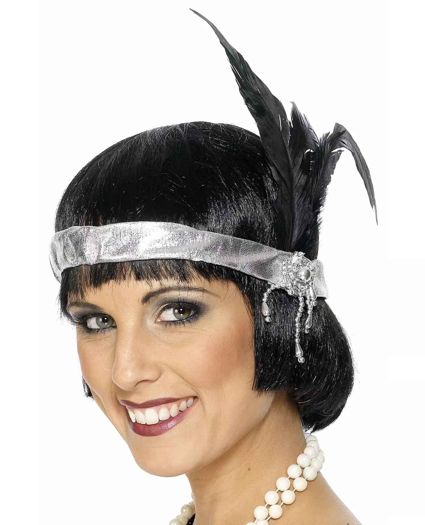 Sølvfarget Charleston-pannebånd med fjær for voksne Med fjær og juvel Dette sølvfargede pannebåndet består av en svart fjær og et juvel (parykk og halskjede er ikke inkludert). Tilbehør som er perfekt å legge til kostymene dine til temafester eller show.
