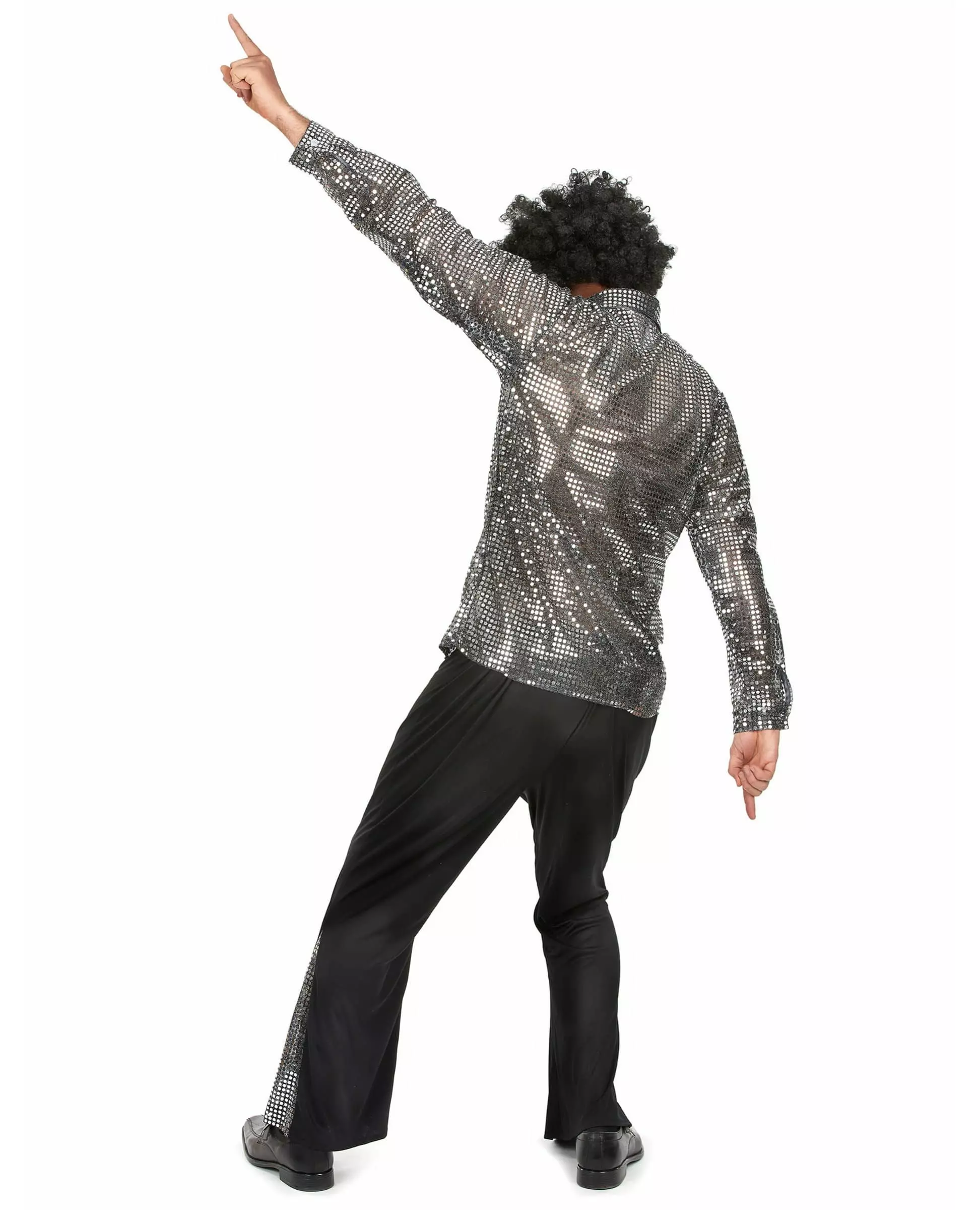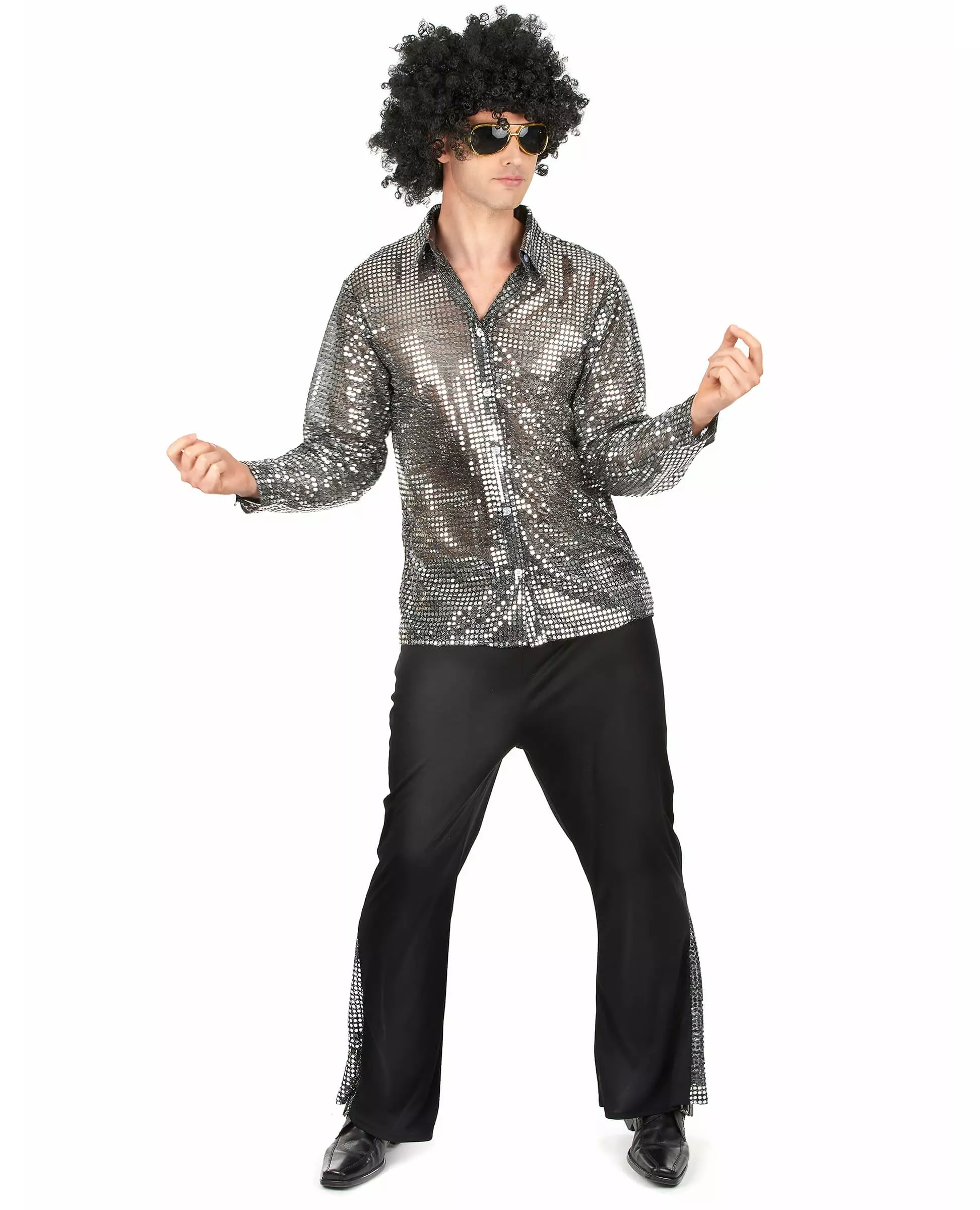Klar til å sette fyr på dansegulvet! Dette discokostymet for menn består av en skjorte og bukser. Skjorten, laget av svart stoff, er dekket av store sølvpaljetter for et blendende utseende! De utsvingte, svarte buksene har elastikk bak i livet. De har en sølvinnsats, som matcher skjorten, på hver side. Dette kostymet vil være perfekt til nyttårsaften, karneval eller en discofest. Inkludert tilbehør: Bukser Skjorte Materiale: 100 % polyester Stell: For hånd Målinformasjon: For størrelse S: bukser ca. 101 cm lange. For størrelse XL: skulderbredde er ca. 60 cm.
