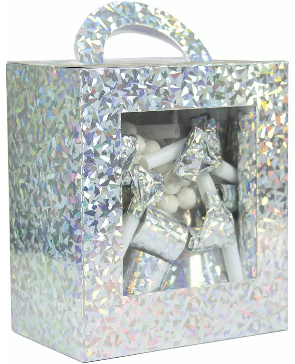 Feir det nye året! Dette nyttårssettet er designet for 10 personer. Det inkluderer derfor: - 10 blåserør - 10 hatter - 10 no-shows - 60 serpentiner - 100 kuler Alt dette tilbehøret er sølvfarget (unntatt kulene til blåserørene). Dette settet vil være ideelt for å feire det nye året med venner eller familie! Inkludert tilbehør: 10 blåserør 10 hatter 10 no-shows 60 serpentiner 100 kuler Materiale: Papp