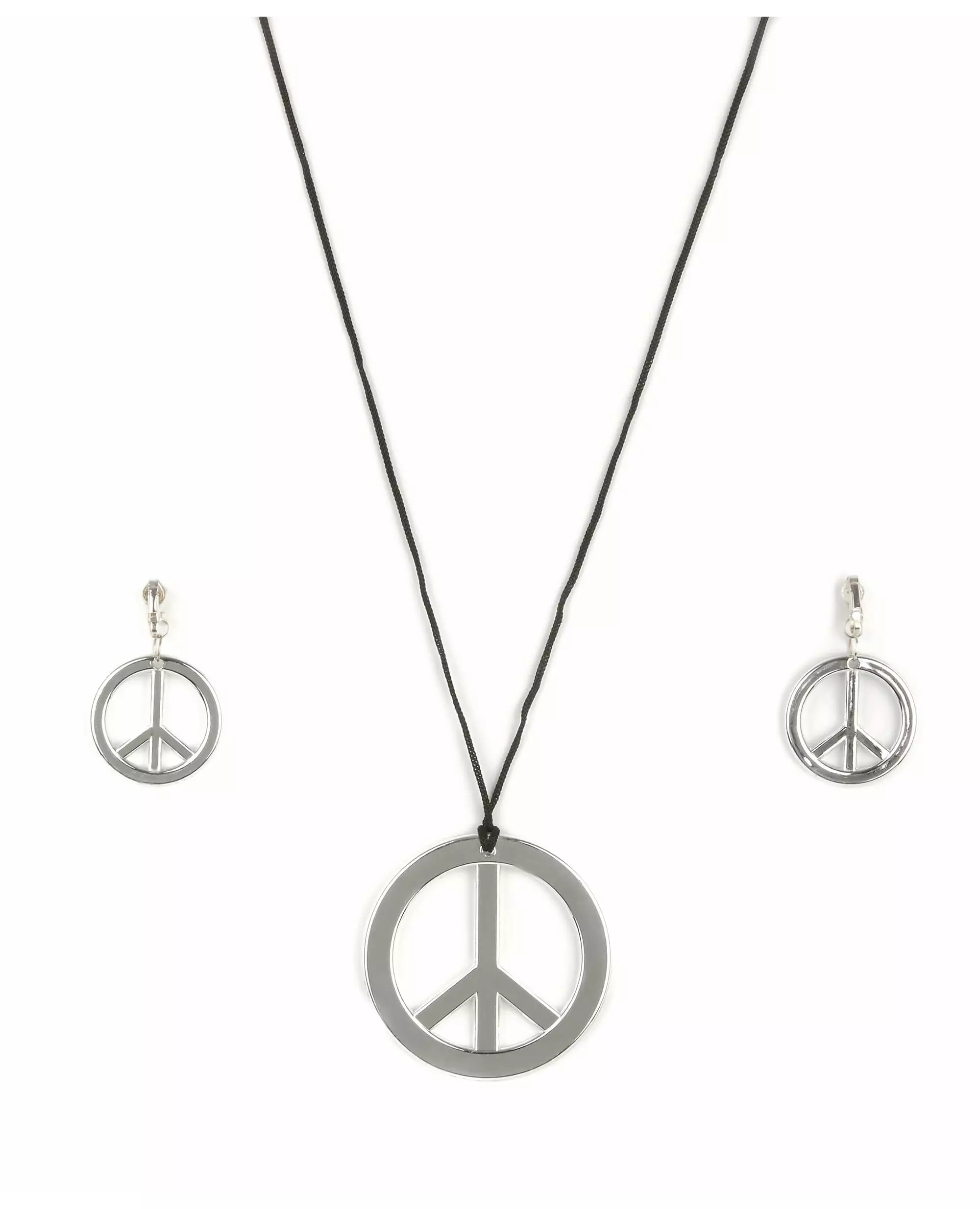 Fred! Dette hippie-smykkesettet i plast består av et par sølvøreringer og et matchende halskjede med svart snor. Du trenger ikke å ha hull i ørene, siden øredobbene dine er veldig enkle å klipse på. Dette tilbehøret vil være ideelt for å fullføre et antrekk på en kostymefest eller temafest. Inkludert tilbehør: Øredobber Halskjede Materiale: Plast