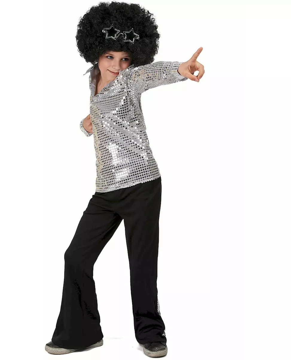 Dansens konge! Dette discokostymet for gutter inkluderer en genser og bukser. Den langermede genseren med en «pai-spade»-krage er svart og fullstendig dekket av skinnende sølvpaljetter. Ensemblet er fôret med lysegrått stoff under, og vil reflektere lyset perfekt som en tradisjonell discokule. «Elefantfot»-buksene er svarte med elastikk i midjen og har to trekantede innlegg nederst på bena som matcher genseren. Dette klassiske, men tidløse settet vil være perfekt for en disco-/80-talls-tema-kostymefest! Inkludert tilbehør: Genserbukser Materiale: 100 % polyester Pleie: Håndvaskbar