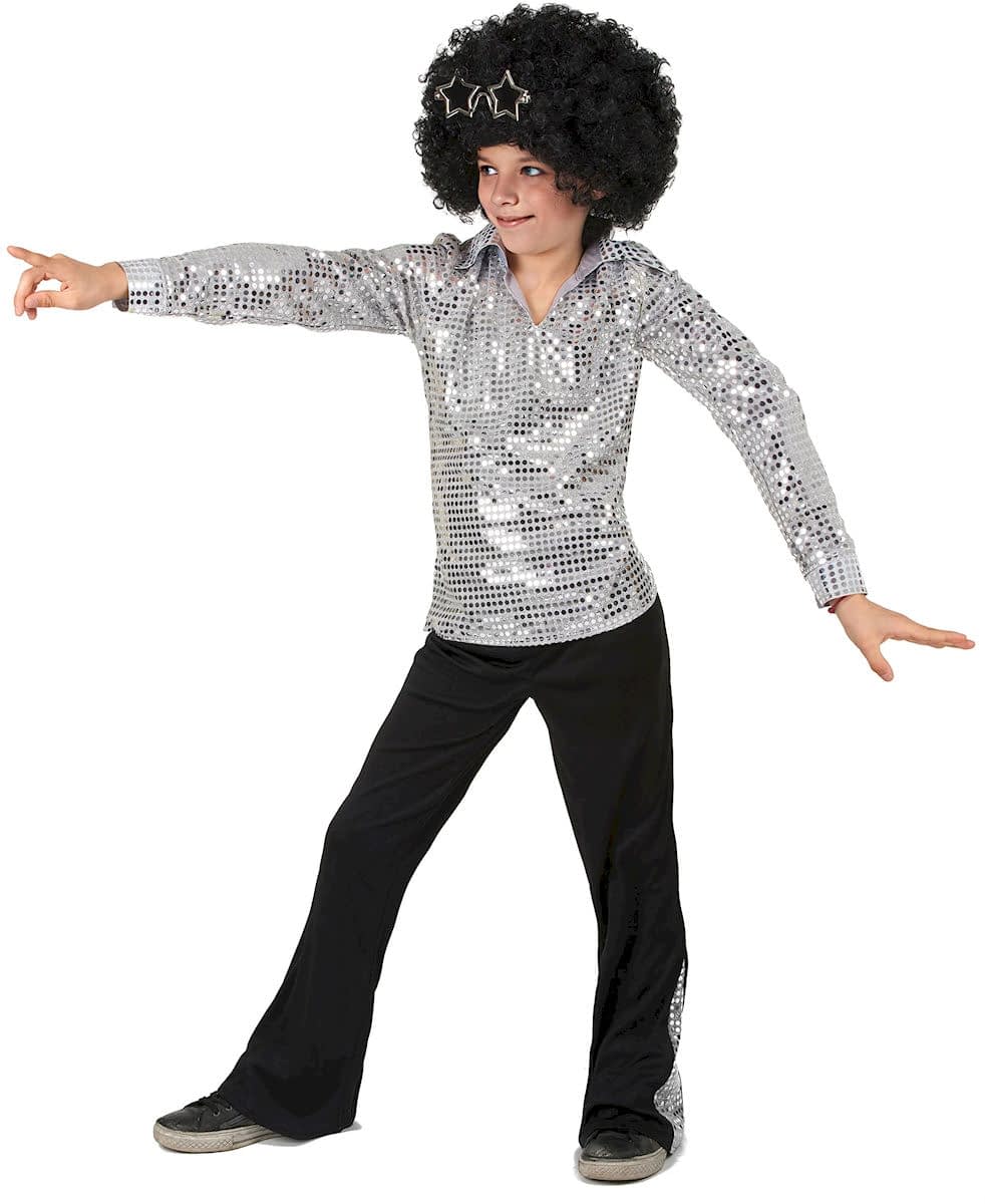 Dansens konge! Dette discokostymet for gutter inkluderer en genser og bukser. Den langermede genseren med en «pai-spade»-krage er svart og fullstendig dekket av skinnende sølvpaljetter. Ensemblet er fôret med lysegrått stoff under, og vil reflektere lyset perfekt som en tradisjonell discokule. «Elefantfot»-buksene er svarte med elastikk i midjen og har to trekantede innlegg nederst på bena som matcher genseren. Dette klassiske, men tidløse settet vil være perfekt for en disco-/80-talls-tema-kostymefest! Inkludert tilbehør: Genserbukser Materiale: 100 % polyester Pleie: Håndvaskbar
