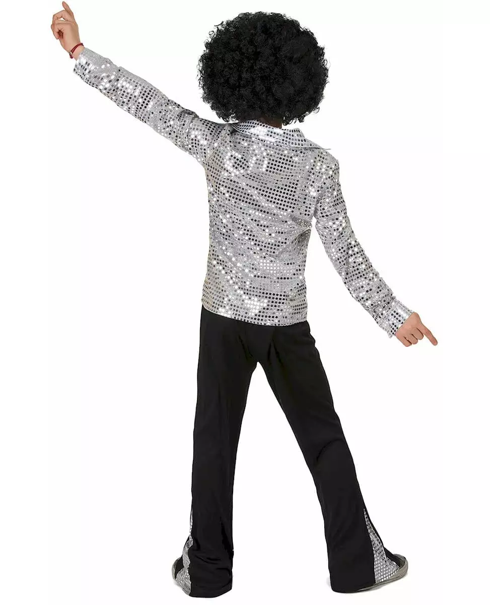 Dansens konge! Dette discokostymet for gutter inkluderer en genser og bukser. Den langermede genseren med en «pai-spade»-krage er svart og fullstendig dekket av skinnende sølvpaljetter. Ensemblet er fôret med lysegrått stoff under, og vil reflektere lyset perfekt som en tradisjonell discokule. «Elefantfot»-buksene er svarte med elastikk i midjen og har to trekantede innlegg nederst på bena som matcher genseren. Dette klassiske, men tidløse settet vil være perfekt for en disco-/80-talls-tema-kostymefest! Inkludert tilbehør: Genserbukser Materiale: 100 % polyester Pleie: Håndvaskbar