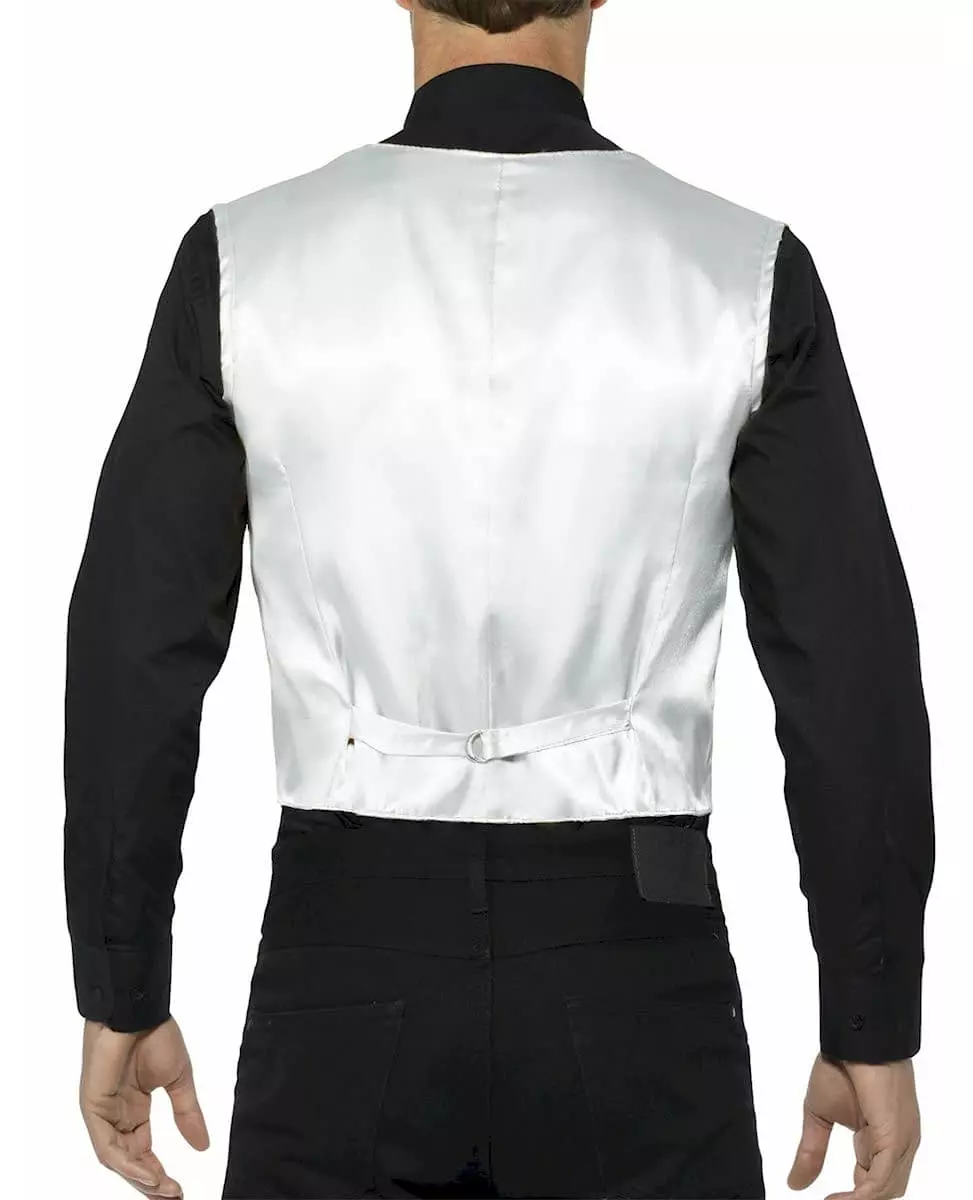 Penger i paljettene mine! Denne sølvfargede paljettvesten er for menn (kun vesten er inkludert). Den har paljetter foran, bak er stoffet sølvfarget sateng. Vesten lukkes med fire knapper foran. Den har også to sølvfargede knytebånd med spenne bak, slik at den kan knytes igjen. Denne vesten er ideell for å fullføre et kostyme som vil få deg til å skinne på en diskotek- eller Charleston-kveld. Inkludert tilbehør: Vest Materiale: 100 % polyester Pleie: Håndvask