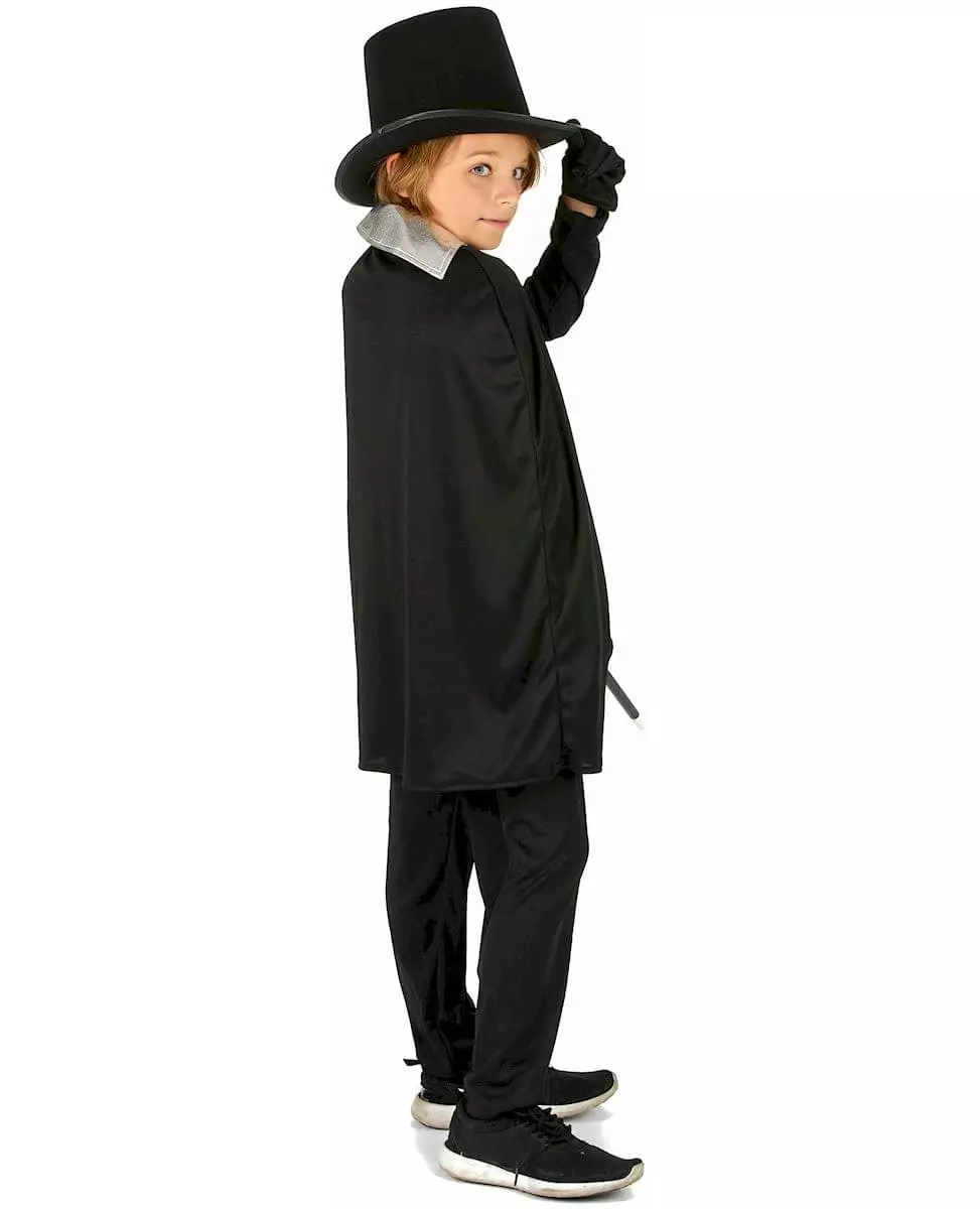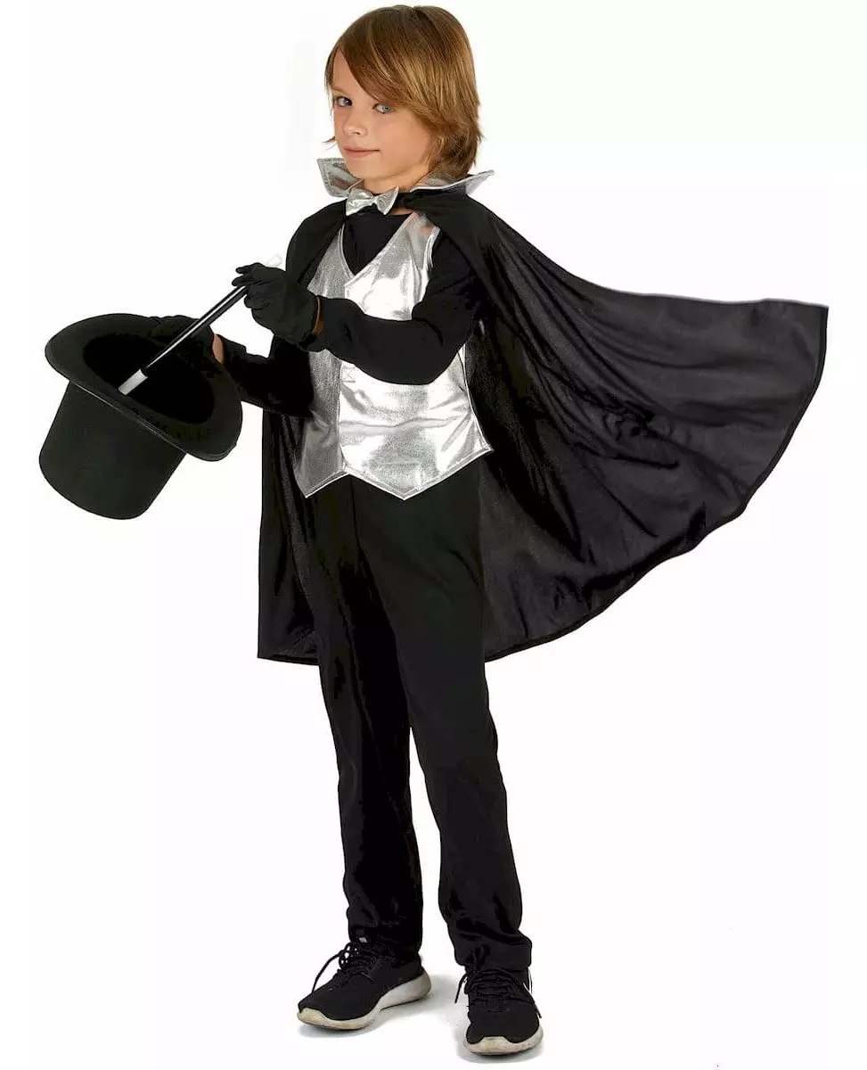 Alakazam! Dette tryllekunstnerkostymet for barn inkluderer en kappe, en vest og et par hansker. Den myke, svarte kappen festes rundt halsen med en liten borrelås, dekorert med en sølvfarget sløyfe. En skinnende sølvkrage kan brukes enten rettet eller formet som du ønsker. Vesten er laget helt av skinnende sølvstoff og lukkes foran med borrelås. Formen på kuttet gir plagget en veldig elegant dimensjon. De inkluderte hanskene er korte og svarte. Liker barnet ditt å sette opp trylleshow? Med dette kostymet vil han føle seg som en ekte tryllekunstner! Inkludert tilbehør: Jakke Kappe Hansker Materiale: 100 % polyester Stell: Håndvaskbar