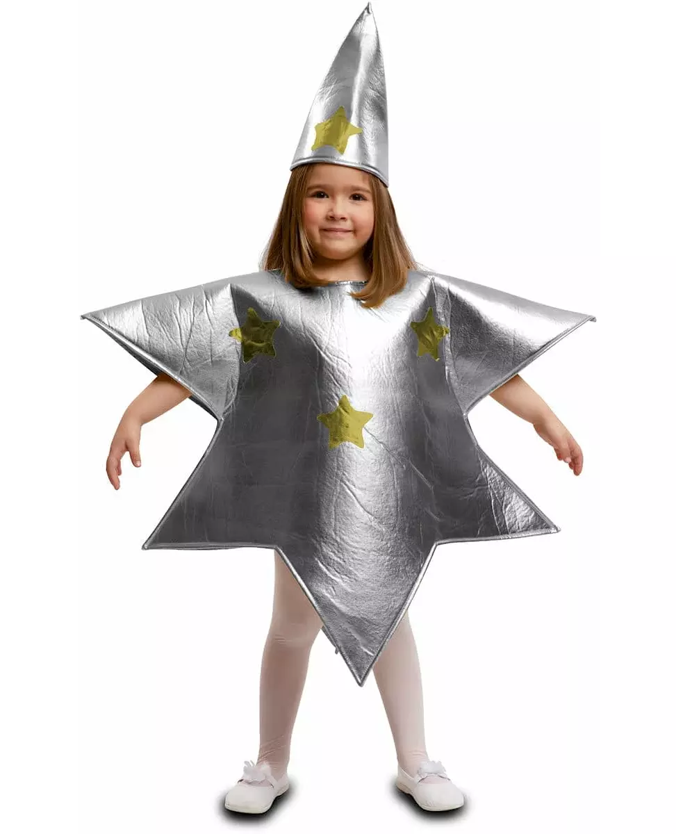 En ekte liten stjerne! Dette sølvstjernekostymet er for barn. Det består av en tunika og en lue (strømpebukser og sko er ikke inkludert). Polyesterkjolen forestiller en stjerne. Den har to hull i armene slik at barnet ditt kan være mer komfortabelt i antrekket sitt. Sølvfarget har dette antrekket gule stjernetrykk foran. Denne tunikaen, som kan tas på som en kjole, selges med en spiss hatt i samme farge. Hatten representerer toppen av stjernen. Det perfekte kostymet for å forvandle den lille prinsessen din til en sublim liten stjerne til karneval! Inkludert tilbehør: Dresshatt Materiale: 100 % polyester Vedlikehold: Håndvask