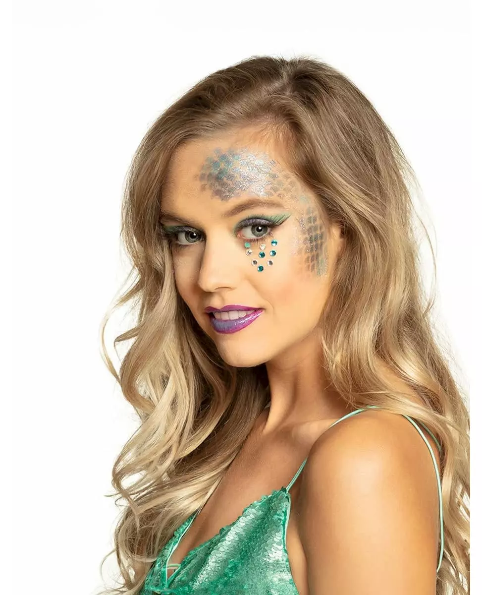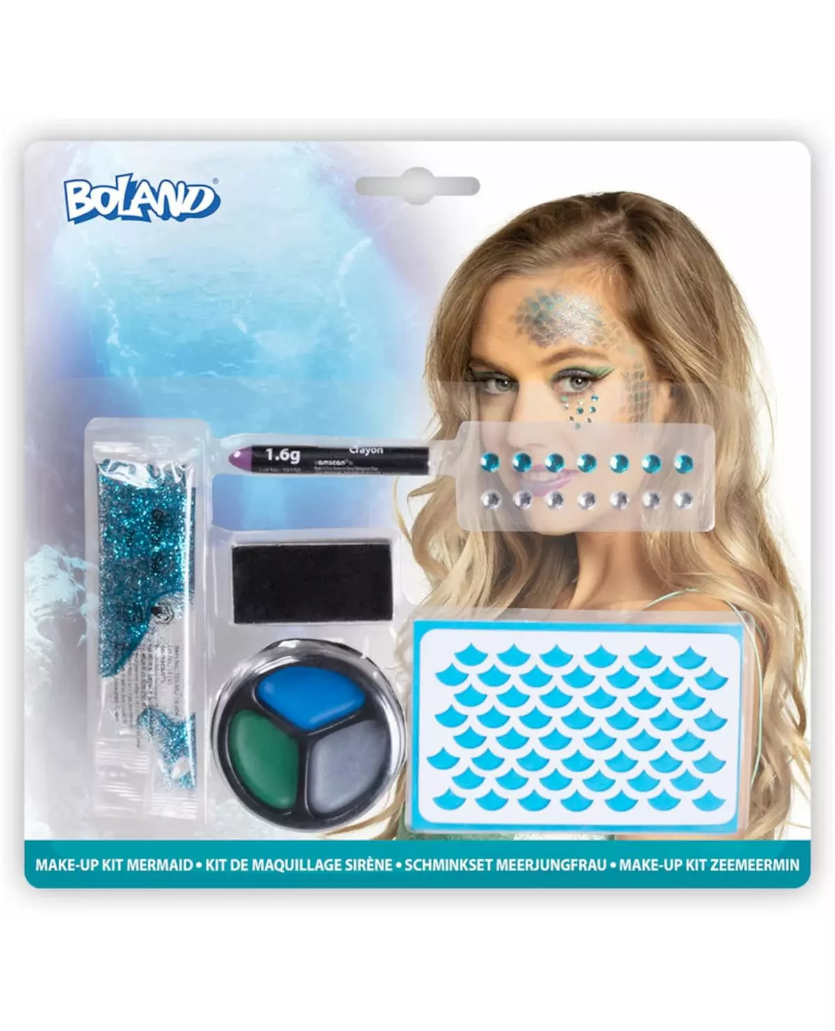 Lag en fantastisk havfruesminke Dette havfruesminkesettet for voksne består av følgende elementer: - 1 sjablong som lar deg lage havfruemønstre - 14 små selvklebende rhinstener. De er blå og sølv - 1 lilla sminkeblyant - 1 palett med blå, grønne og grå øyenskygger - 1 pose turkis glittergel - 1 svamp Dette svært komplette settet lar deg lage en magisk havfruesminke til karnevalet. Inkludert tilbehør: 1 sjablong 14 rhinstener 1 sminkeblyant 1 palett med øyenskygger 1 pose glittergel 1 svamp