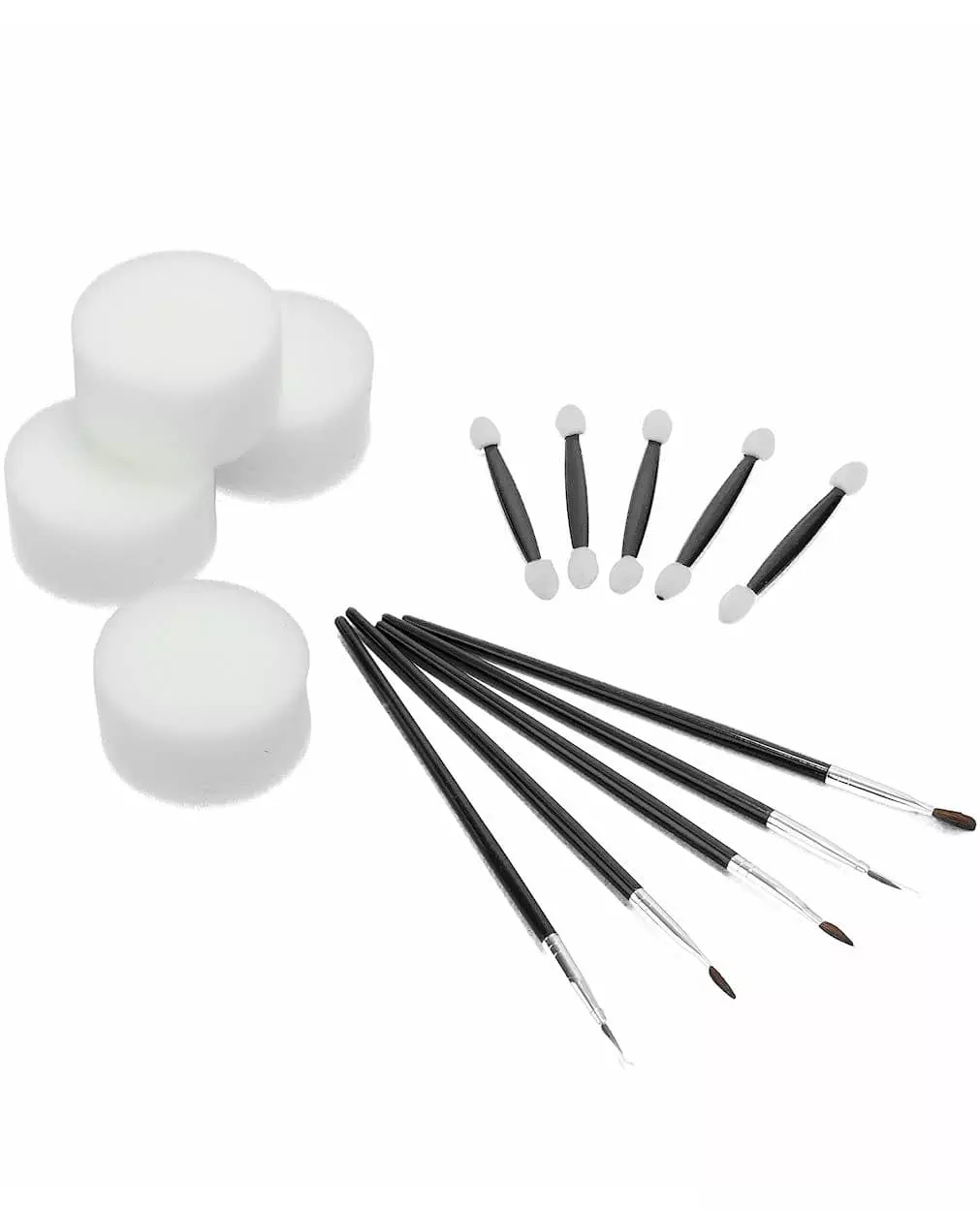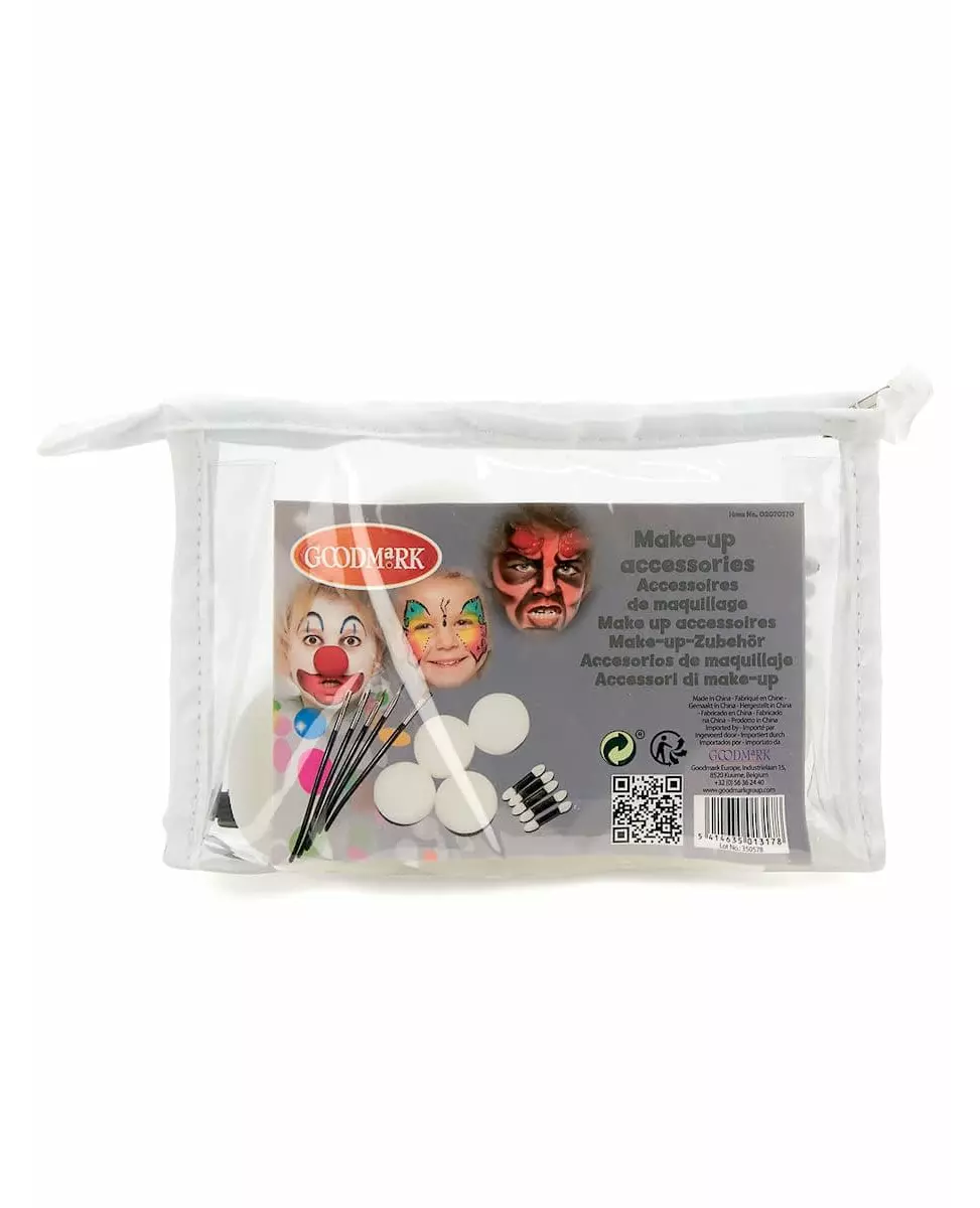 Børster og svamper! Dette sminkesettet består av mange elementer: - 5 børster - 5 børster i forskjellige størrelser - 4 svamper Dette tilbehøret selges i et lite plastetui, og lar deg lage flott festsminke til karneval eller Halloween. Inkludert tilbehør: 5 børster 4 svamper 5 børster