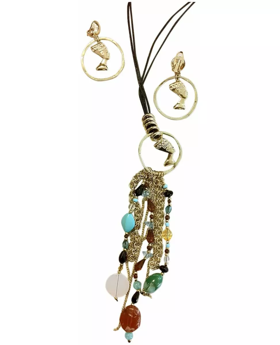 Bli vakrere enn Nefertiti! Dette settet med den egyptiske dronningen er for kvinner. Det består av to øredobber og et halskjede. De håndlagde gulløredobbene består av en sirkel med profilen til en egyptisk dronning inni. De har klipslukking. Halskjedet som matcher øredobbene består av en svart lenke hvor vi finner gullsirkelen med profilen, samt perler, kunstige steiner og gullkjeder. Det lukkes med en gullspenne og måler omtrent 45 cm langt. Dette tilbehøret vil være perfekt for å fullføre ditt dronningantrekk til en egyptisk-tema kveld eller enhver annen festlig anledning. «Copyright Widmann SRL». «Copyright Widmann SRL. Inkludert tilbehør: 2 øredobber Halskjede