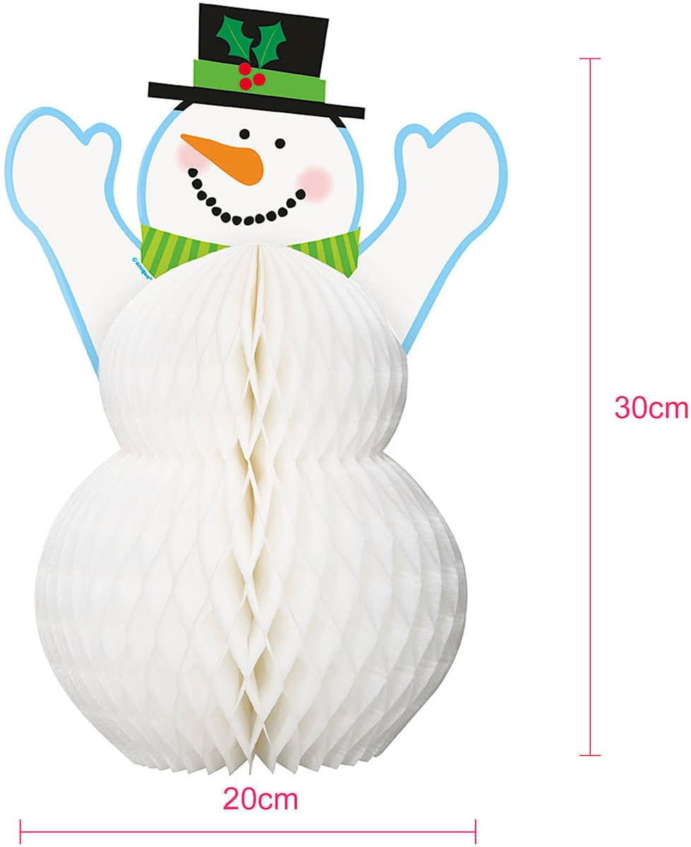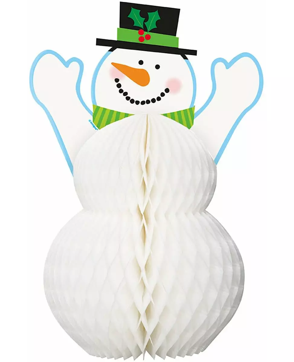 Fullfør dekorasjonen din med denne søte snømannen. Dette midtstykket av papir forestiller en snømann. Det måler omtrent 30 cm i høyden og 20 cm i bredden. Magen er laget av hvitt bikakepapir. Den brettes ut 360° for å gi volum til denne dekorasjonen. Dette midtstykket vil være perfekt for å fullføre snødekorasjonen din på julaften. Inkludert tilbehør: Midstykke Materiale: Kartong