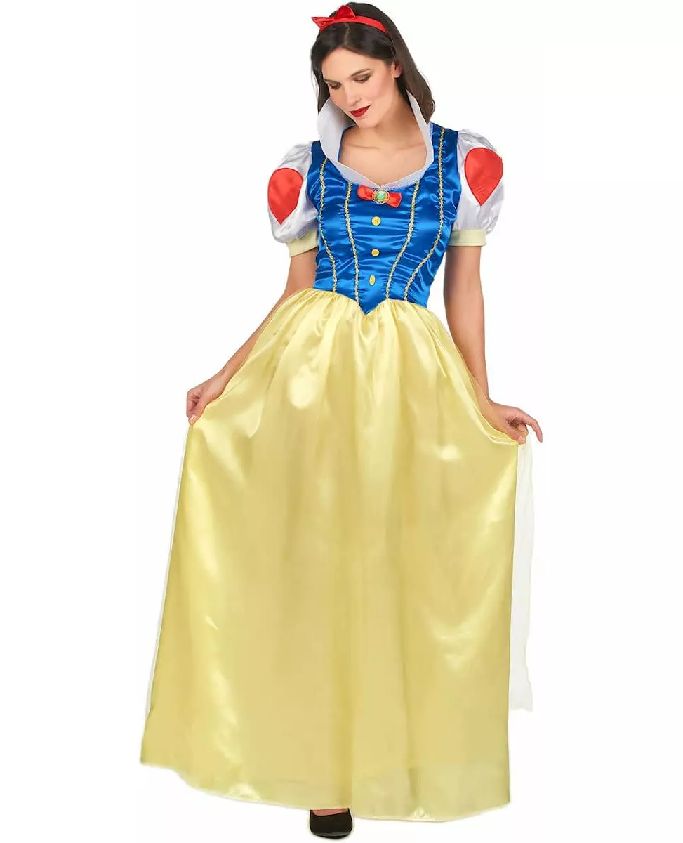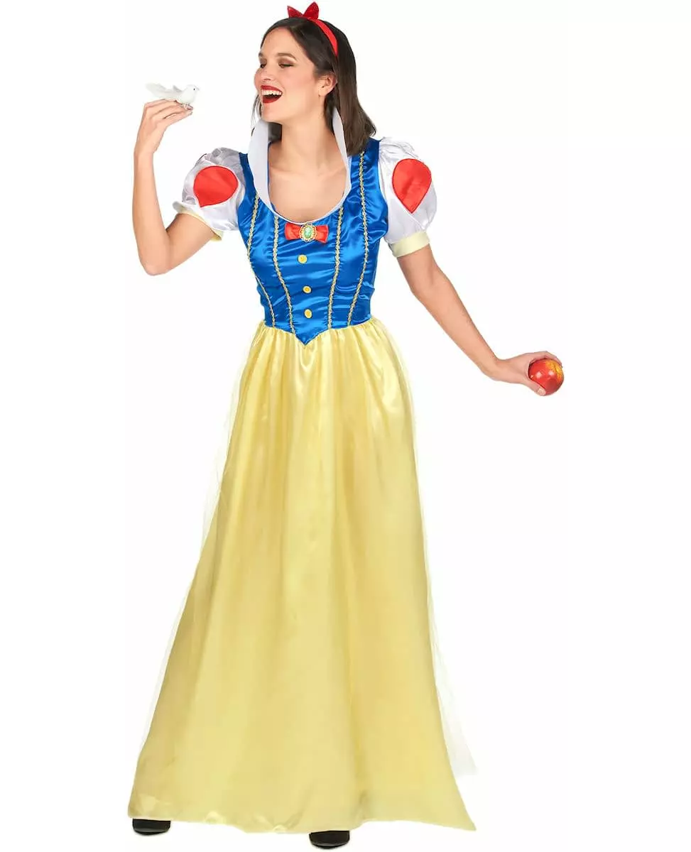 En dag kommer prinsen min ... Dette snøprinsessekostymet for kvinner består av en kjole og et hodeplagg (sko ikke inkludert). Den lange kjolen har korte, puffede røde og hvite ermer. Brystet er blått med gullflettet stoff. Kragen, laget av tykk filt, er hvit og har en rød sløyfe med en lysegrønn imitert kamé i midten. Kjolens nederste del er gul. Den er toppet med et gult slør som vil gi et snev av letthet til antrekket. Kjolen er elastisk i livet. Hodeplagget (pannebåndet) representerer en rød sløyfe og vil pynte opp håret ditt. Dette kostymet vil være perfekt for å spille en vakker eventyrprinsesse på en utkledningsfest med venner eller for å feire karneval. Inkludert tilbehør: Kjole Hodeplagg Materiale: 100 % polyester Stell: Håndvask Målinformasjon: For størrelse S er kjolen omtrent 160 cm lang