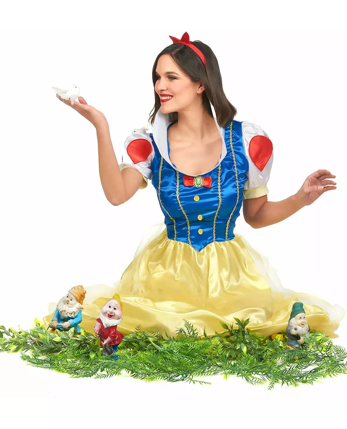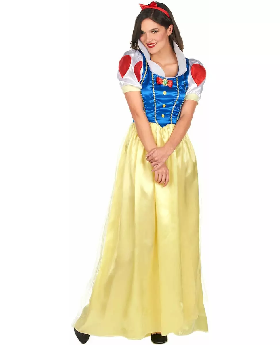 En dag kommer prinsen min ... Dette snøprinsessekostymet for kvinner består av en kjole og et hodeplagg (sko ikke inkludert). Den lange kjolen har korte, puffede røde og hvite ermer. Brystet er blått med gullflettet stoff. Kragen, laget av tykk filt, er hvit og har en rød sløyfe med en lysegrønn imitert kamé i midten. Kjolens nederste del er gul. Den er toppet med et gult slør som vil gi et snev av letthet til antrekket. Kjolen er elastisk i livet. Hodeplagget (pannebåndet) representerer en rød sløyfe og vil pynte opp håret ditt. Dette kostymet vil være perfekt for å spille en vakker eventyrprinsesse på en utkledningsfest med venner eller for å feire karneval. Inkludert tilbehør: Kjole Hodeplagg Materiale: 100 % polyester Stell: Håndvask Målinformasjon: For størrelse S er kjolen omtrent 160 cm lang