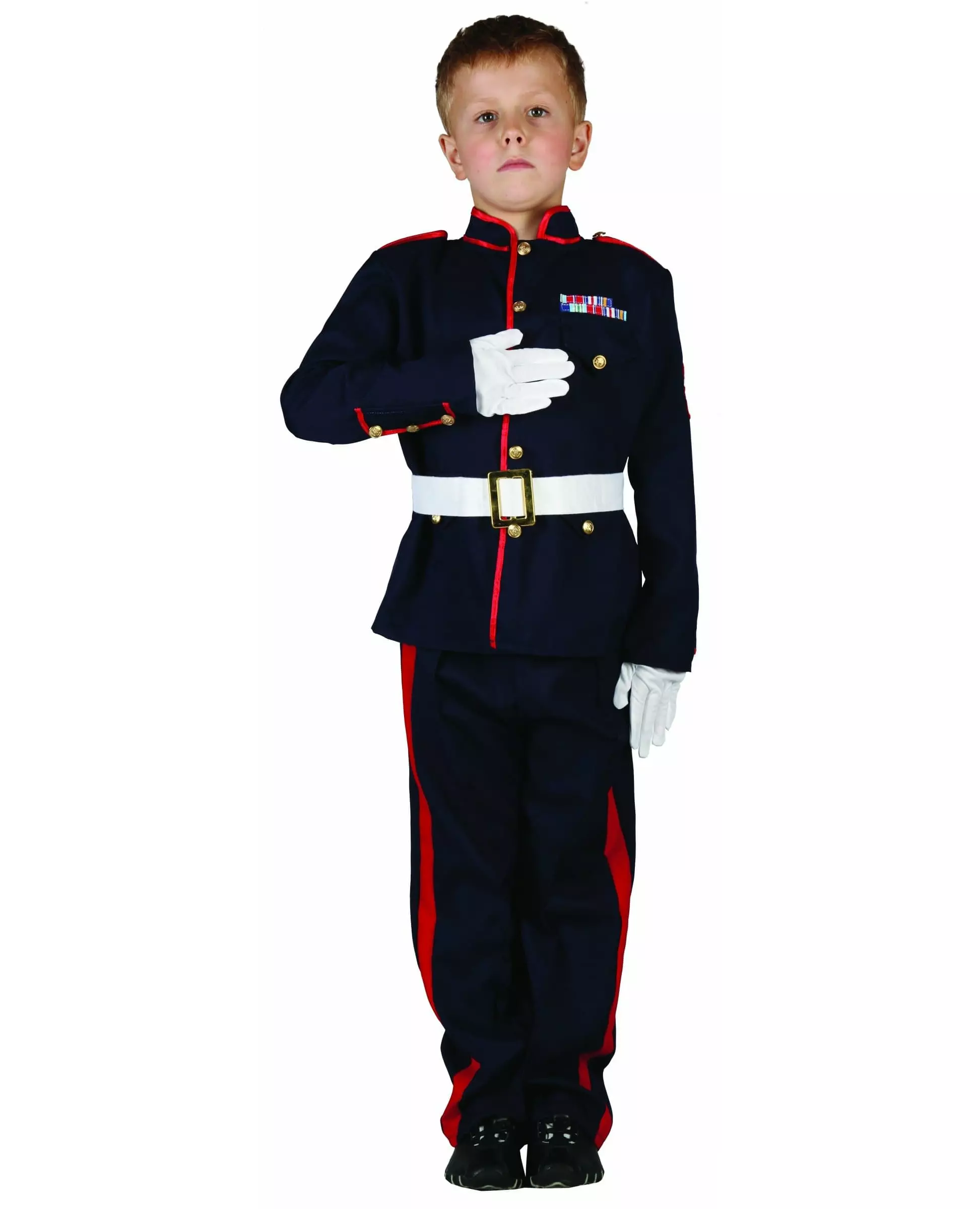Pene gullknapper! Dette guttesoldatkostymet består av marineblå bukser med strikk i livet, en langermet t-skjorte og et belte (hansker og sko er ikke inkludert). Toppen av imitasjonsjakkekostymet har pene gullknapper for en autentisk effekt. Røde kanter og striper er gjennom hele antrekket. Et hvitt stoffbelte vil fullføre dette kostymet. Denne uniformen er ideell for karneval eller et utkledningsarrangement. Inkludert tilbehør: T-skjorte Bukser Belte Materiale: 100 % polyester Vedlikehold: Håndvask