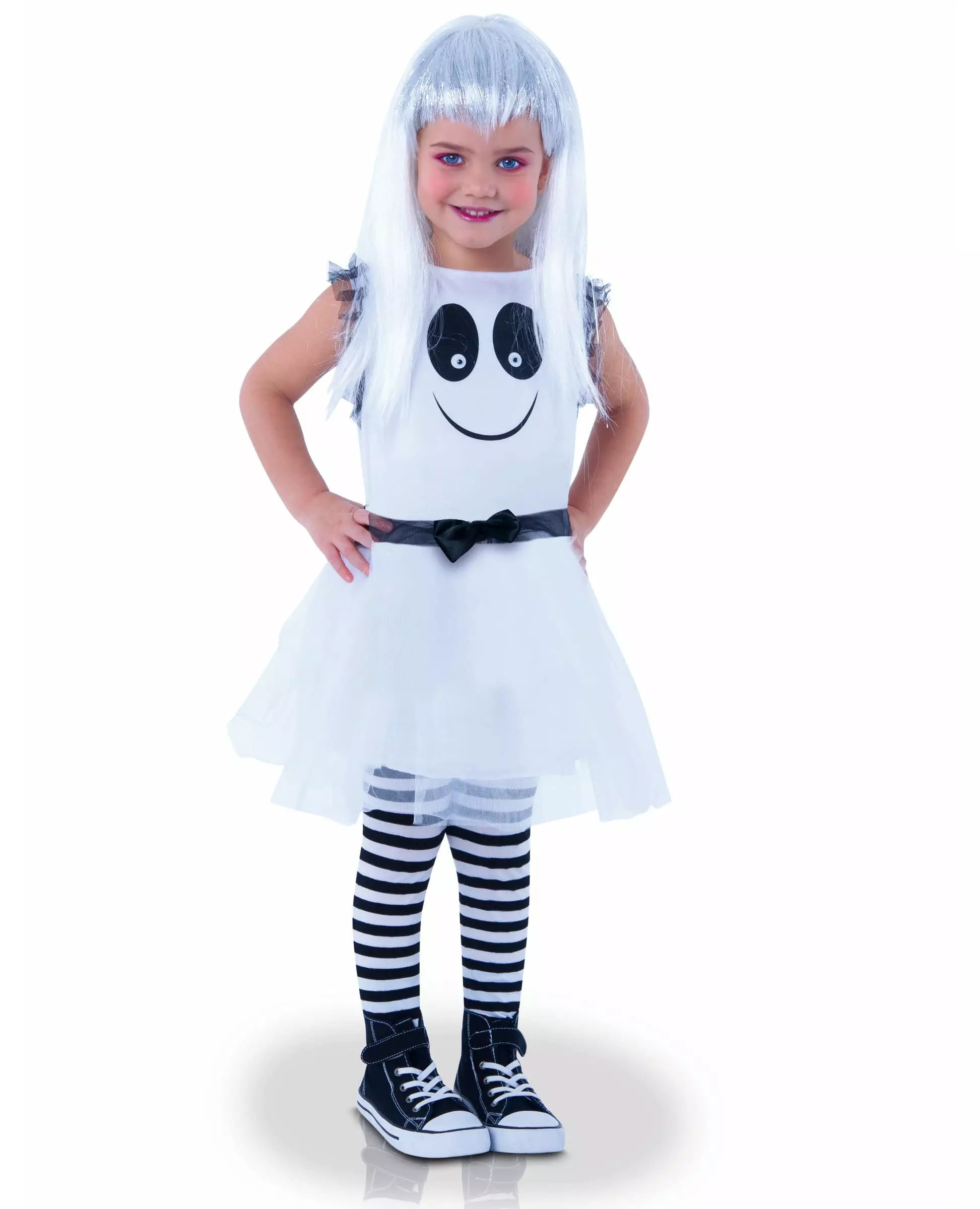 Et søtt lite spøkelse! Dette spøkelseskostymet inkluderer en kjole og et par strømpebukser. Den hvite kjolen har et spøkelsesansikt med bevegelige øyne foran. Den er ermeløs. Et svart belte med en fin liten sløyfe er sydd til kjolen. Nederdelen matcher settet og kommer med et par svarte og hvite strømpebukser. Denne kjolen vil være perfekt som kostyme til datteren din til Halloween-festen! Inkludert tilbehør: 1 kjole 1 par strømpebukser Materiale: 100 % polyester Vedlikehold: Håndvask