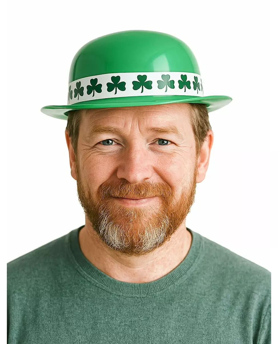 Legg til et snev av grønt i kostymet ditt. Denne bowlerhatten for voksne er laget av myk plast. Den er grønn i fargen og har en hodeomkrets på omtrent 56 cm. Et hvitt papirbånd trykt med kløver er også tilstede ved bunnen av hatten. Dette tilbehøret vil være perfekt for å fullføre antrekket ditt til St. Patricks dag. Inkludert tilbehør: Hattmateriale: Plast.