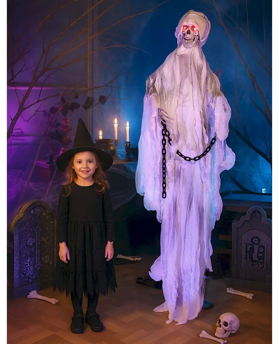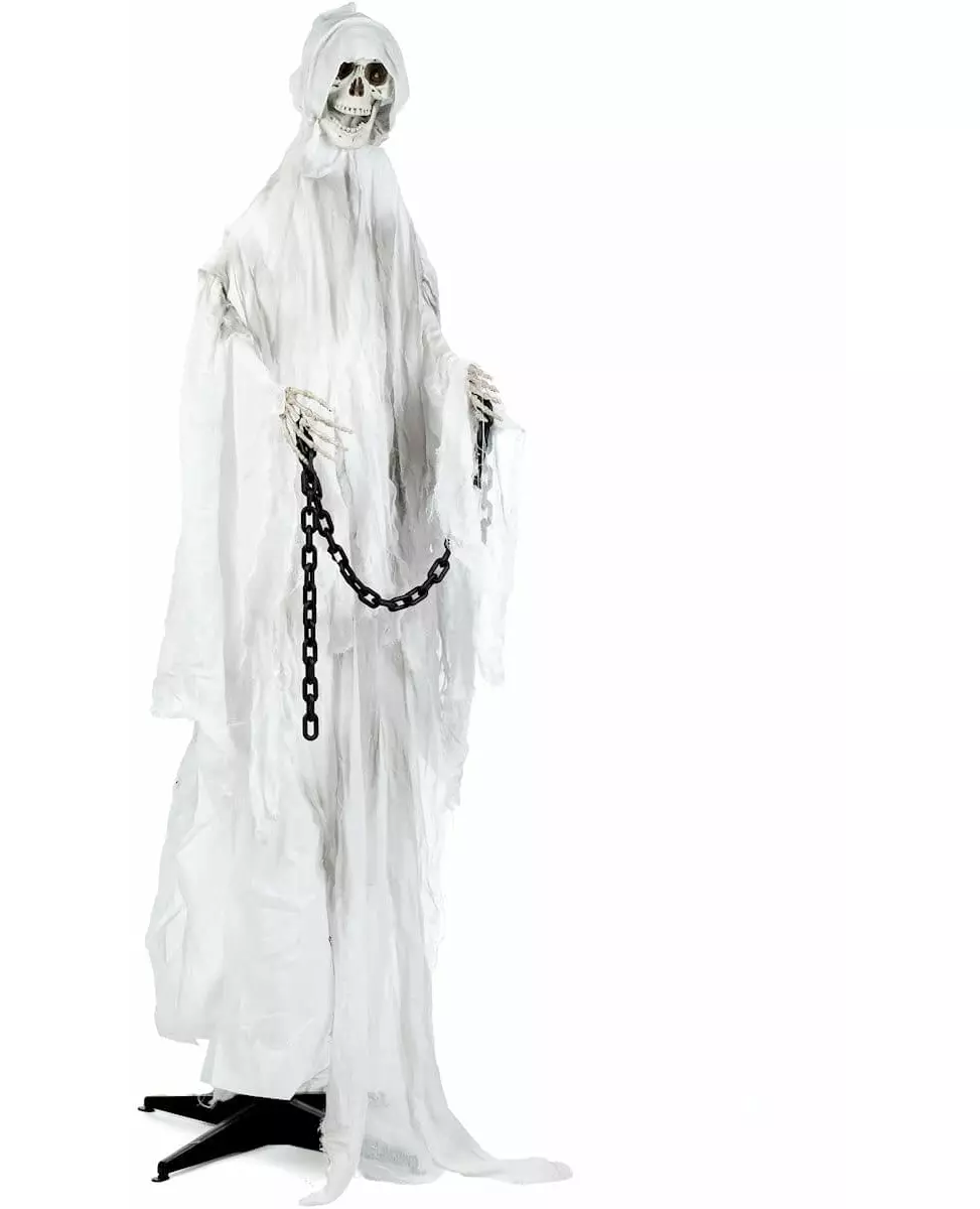 Ondskapen sover aldri! Denne stående, lenkede spøkelsesdekorasjonen måler omtrent 190 cm. Skjelettet er dekket av en slitt kappe og hette. Skjelettet har en vidåpen munn. Huden er hvit, i likhet med kappen og hetten. Øynene er to svarte hull som avslører en liten rød prikk, og nesen er hul. Den holder en svart lenke mellom sine tynne skjelettfingre. Velg denne lenkede spøkelsesdekorasjonen til din neste Halloween-fest for å skremme gjestene dine! Inkludert tilbehør: Dekorasjonsmateriale: 50 % polyetylen, 30 % polyester, 20 % jern