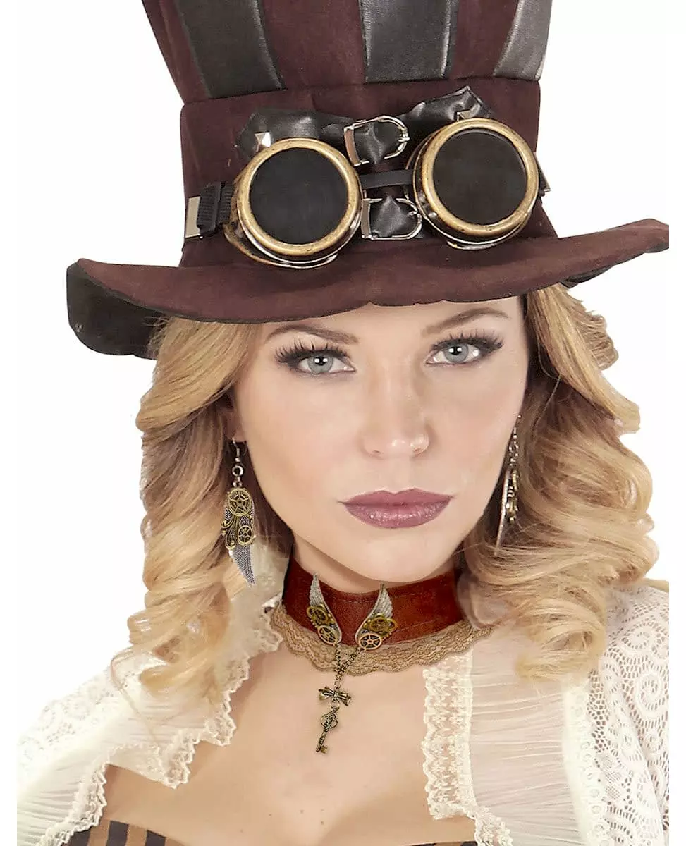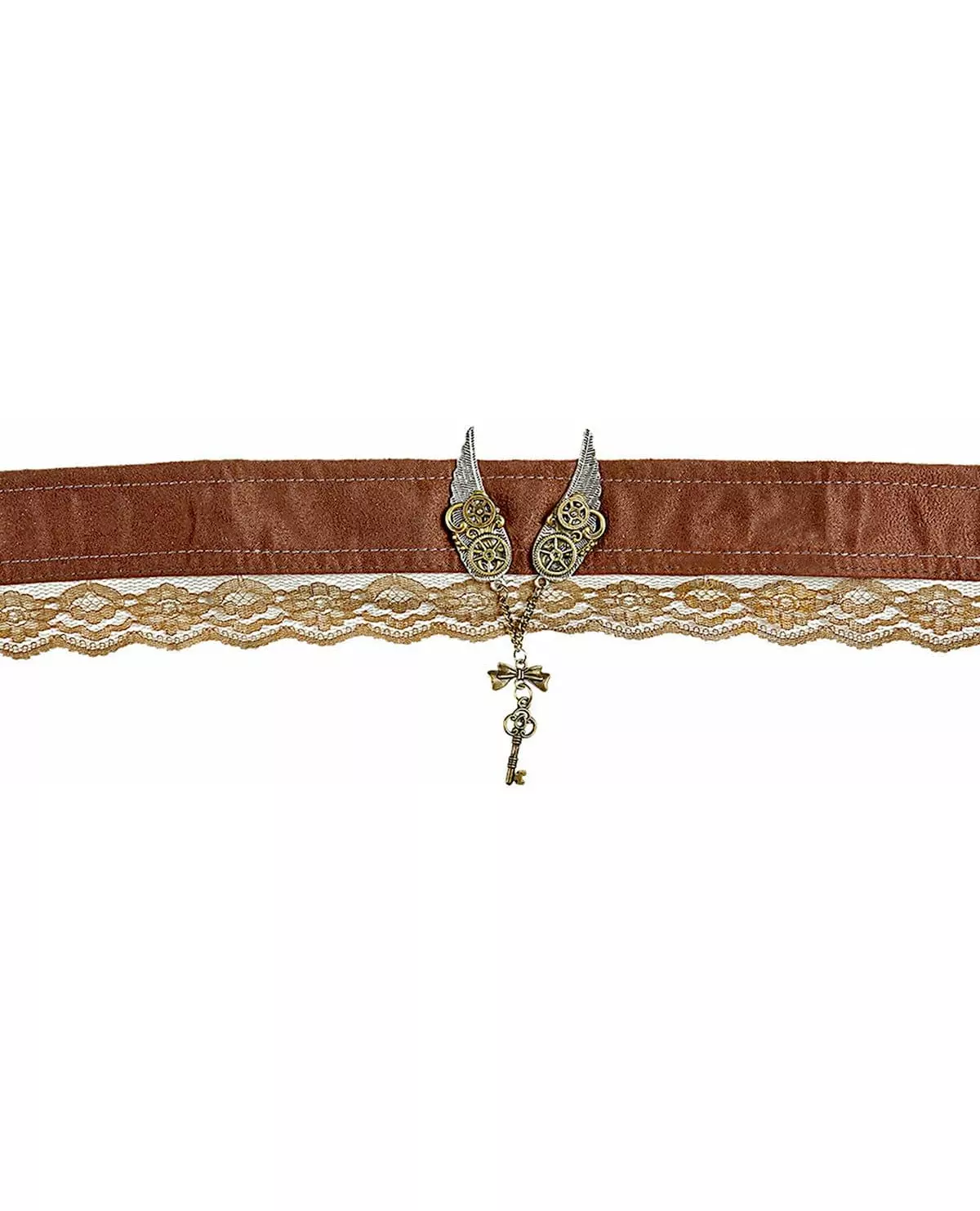 Ta i bruk Steampunk-stilen Dette Steampunk-choker-kjedet er for voksne. Det er laget av brunt stoff med lysere blonder. I midten er det to vinger med tannhjul og en dinglende nøkkel. Halskjedet festes med borrelås. Dette halskjedet vil være det perfekte tilbehøret til Steampunk-kostymet ditt på et utkledningsarrangement. Inkludert tilbehør: Halskjede Materiale: 100 % polyesterstoff
