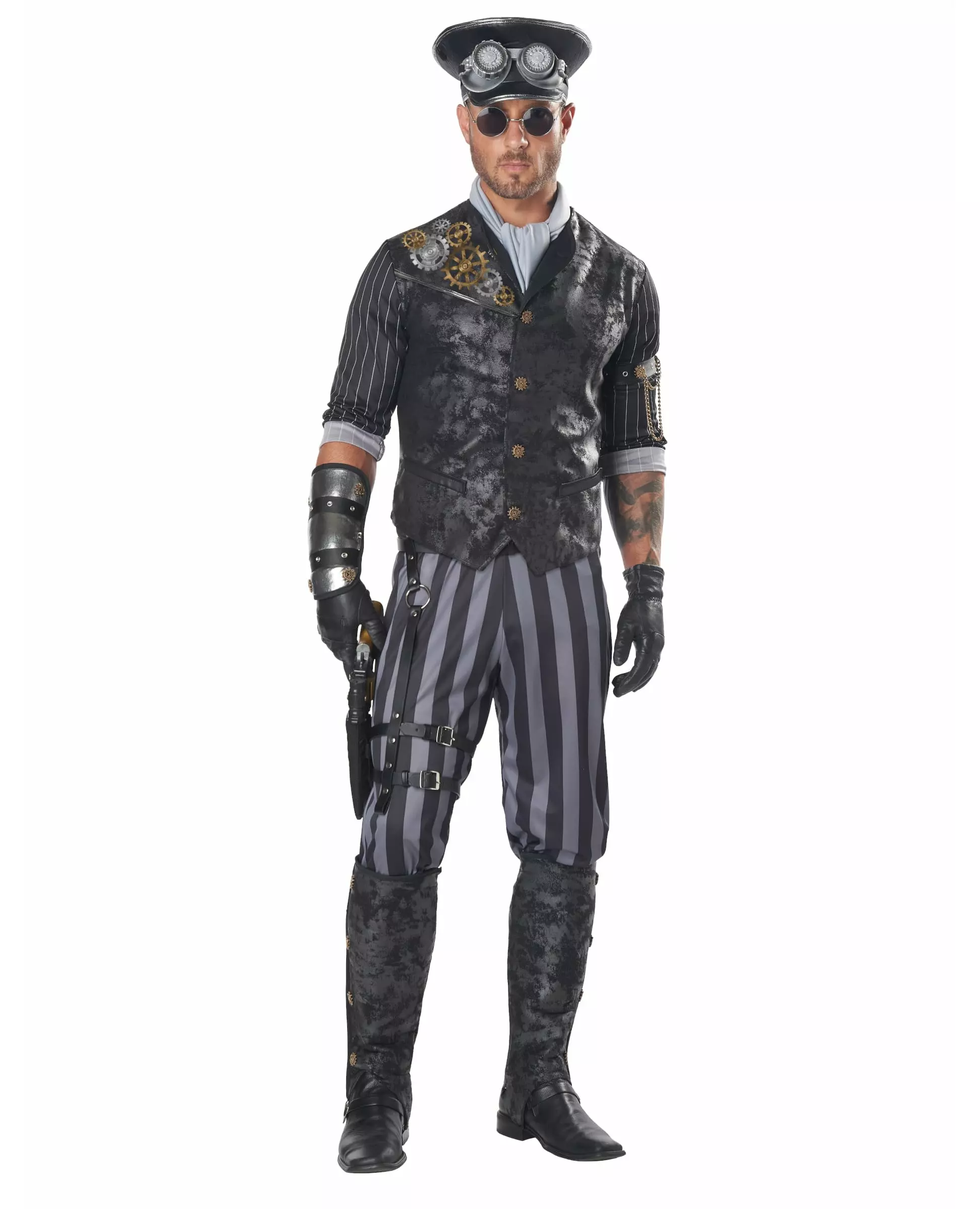 Legemliggjør en original karakter med dette steampunk-kapteinkostymet for menn! Dette steampunk-kapteinkostymet for menn inkluderer en hatt, et par fancy briller, en topp med vest, et armbånd, en hanske, bukser og et skjerf. Hatten er svart med en skjerm hvor du kan plassere de fancy brillene. Skjerfet er grått. Toppen er svart med lange ermer og hvite vertikale striper, og du kan bruke den svarte vesten i kunstskinn med gullknapper og metalliske tannhjul på kragen over. Buksene har grå og svarte vertikale striper, og du har svarte hansker og et sølvfarget armbånd med svarte bånd som tilbehør. Dette kostymet er perfekt for en steampunk-temafest eller karneval! Inkludert tilbehør: Hatt Briller Skjorte med vest Armbånd Hanske Bukser Tanktopper Skjerf Materiale: 100 % polyester Vedlikehold: Håndvask