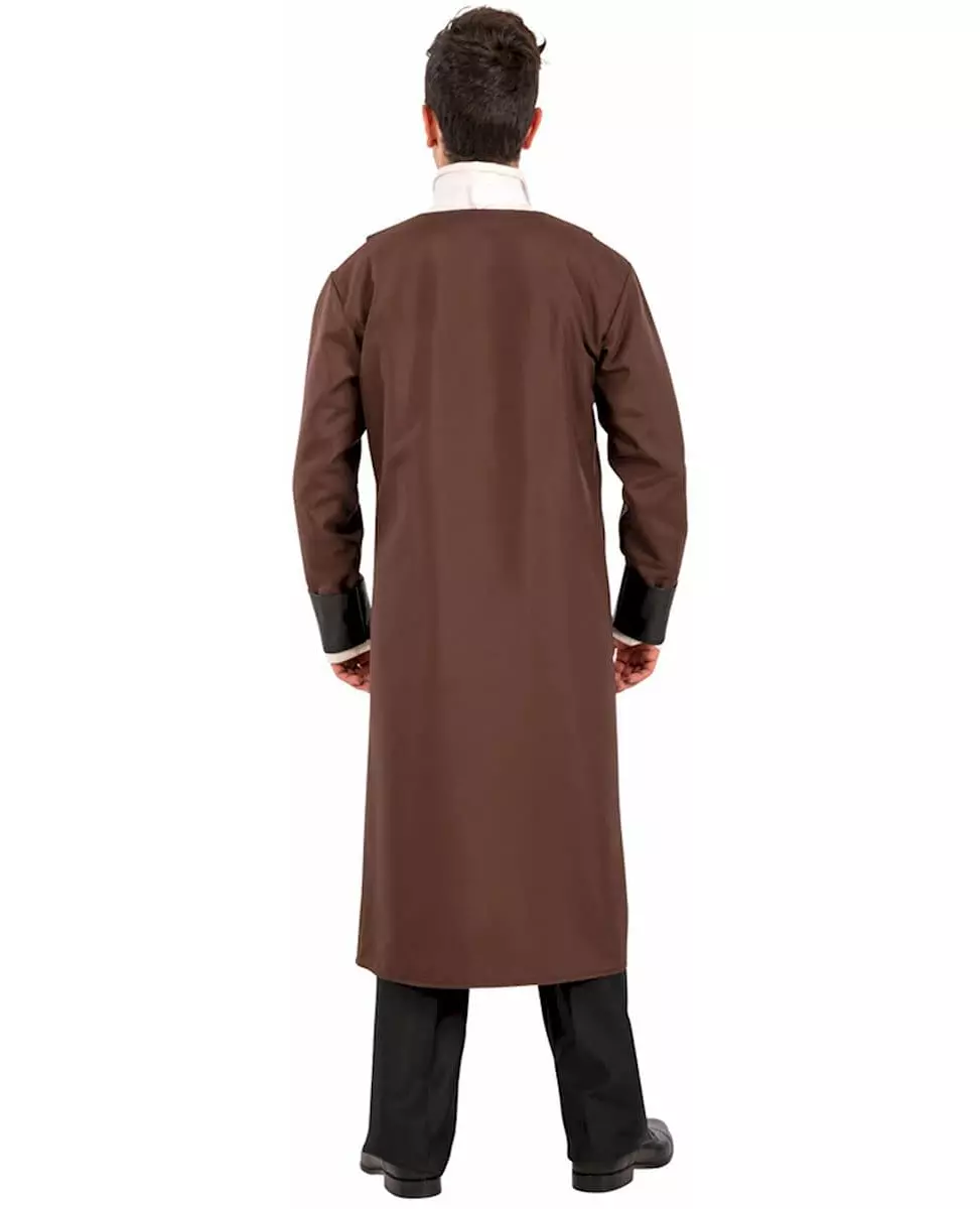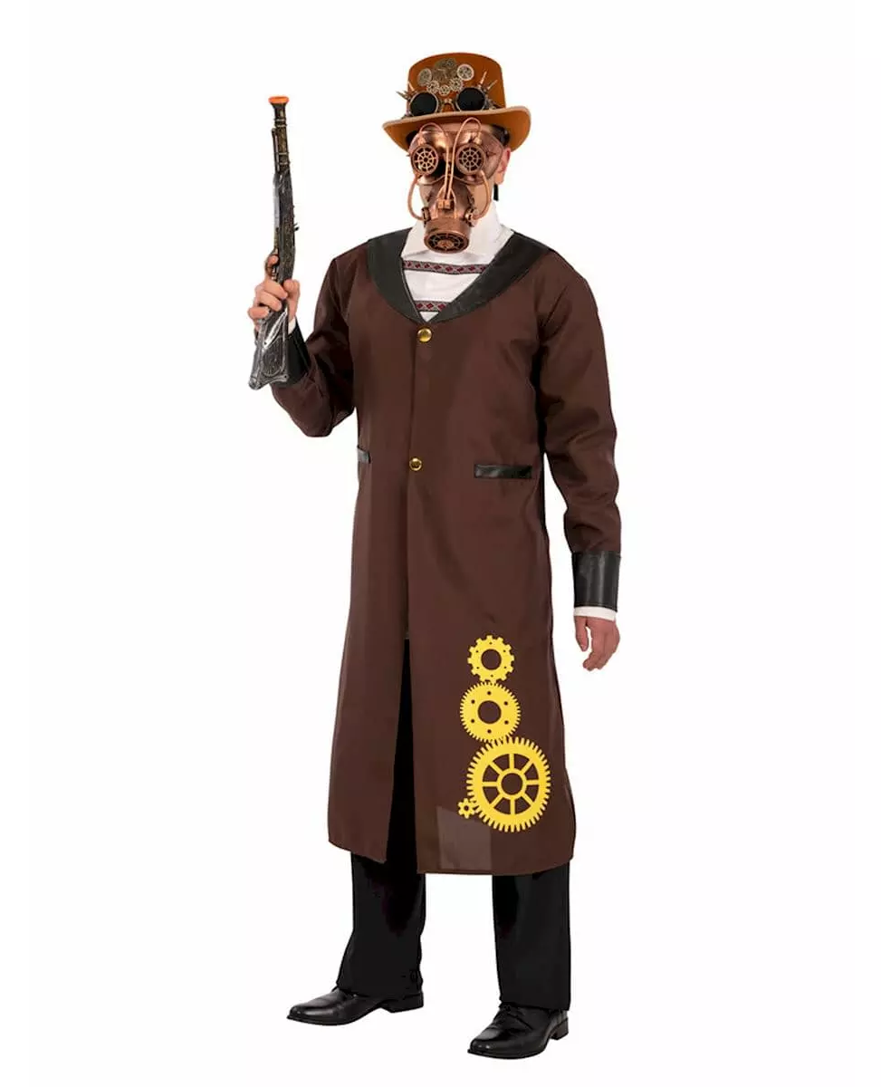 Ta på deg Steampunk-stilen Dette steampunk-kostymet er for menn. Det består av en jakke og en jabot (maske, hatt, pistol ikke inkludert). Stoffjakken er brun med gullhjul nederst, falske gullknapper og svarte slag i kunstskinn. Jaboten er hvit med fargede striper og en hvit krage. Dette steampunk-kostymet vil være ideelt til Halloween. Inkludert tilbehør: Jabot-jakke Materiale: 100 % polyester Vedlikehold: Håndvask