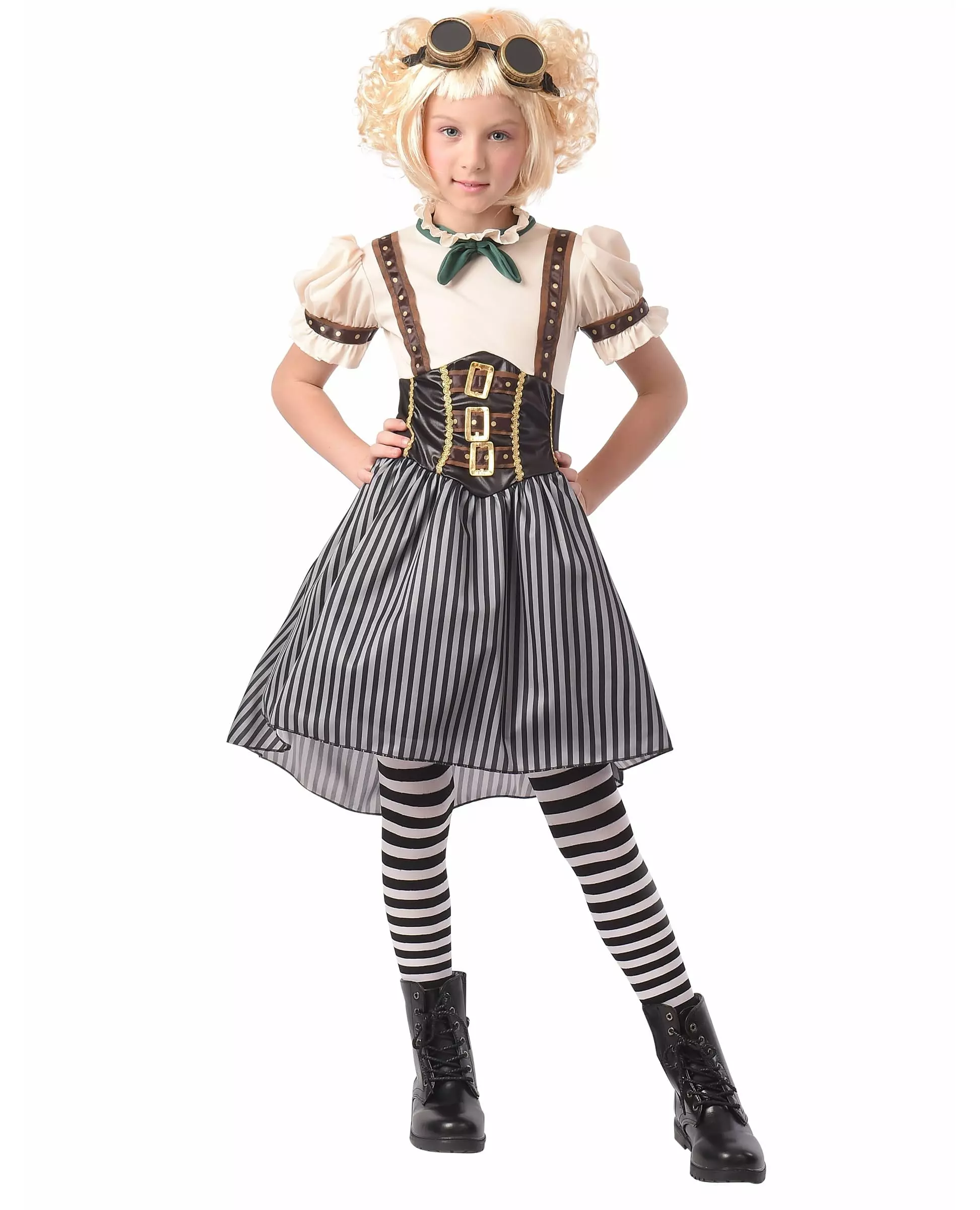 Et steampunk-kostyme til datteren din! Dette steampunk-kostymet for jenter består av en kjole og et par briller (sko, strømpebukser og parykk er ikke inkludert). Kjolens overdel er beige og har korte puffermer. Den er dekorert med et imitert korsetttrykk og imiterte brune stropper. Den har en liten jordbærkrage utsmykket med et grønt bånd. Nederdelen av kjolen er trykket med grå og svarte vertikale striper. Runde briller i steampunk-stil fullfører antrekket perfekt. Velg en original stil med dette steampunk-kostymet til karneval eller en steampunk-tema-kveld! Inkludert tilbehør: Kjole. Briller. Stell: Håndvask.