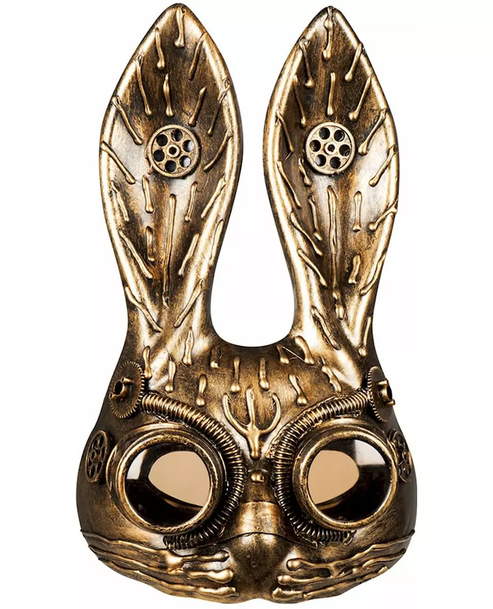Din Steampunk-kaninmaske! Denne pregede Steampunk-halvmasken er for voksne. Den representerer hodet til en kanin i Steampunk-versjon, den er metallisk gullfarget med fjær- og tannhjulmønstre. Oransjetonede briller er integrert i masken og vil sikre god synlighet! Denne halvmasken vil være perfekt for et kostymefest med dyretema eller til karneval! Inkludert tilbehør: En halvmaske Stell: Håndvask