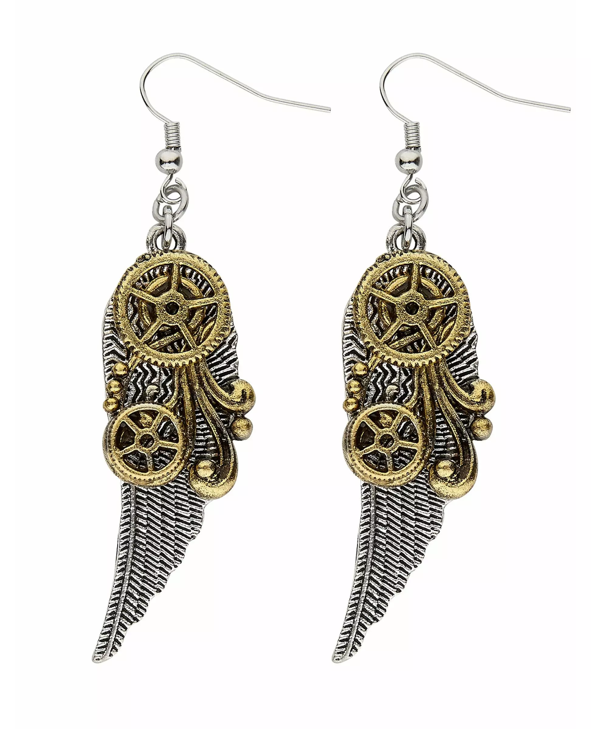 Helt i metall! Disse steampunk-øredobbene er for voksne. Disse øredobbene i steampunk-stil har en sølvbelagt metallfjær utsmykket med en gyllen tannhjulmekanisme. Disse steampunk-øredobbene vil være en flott måte å pynte opp kostymet ditt på til utkledningsfester eller karneval! © Copyright Widmann SRL. Inkludert tilbehør: øredobber