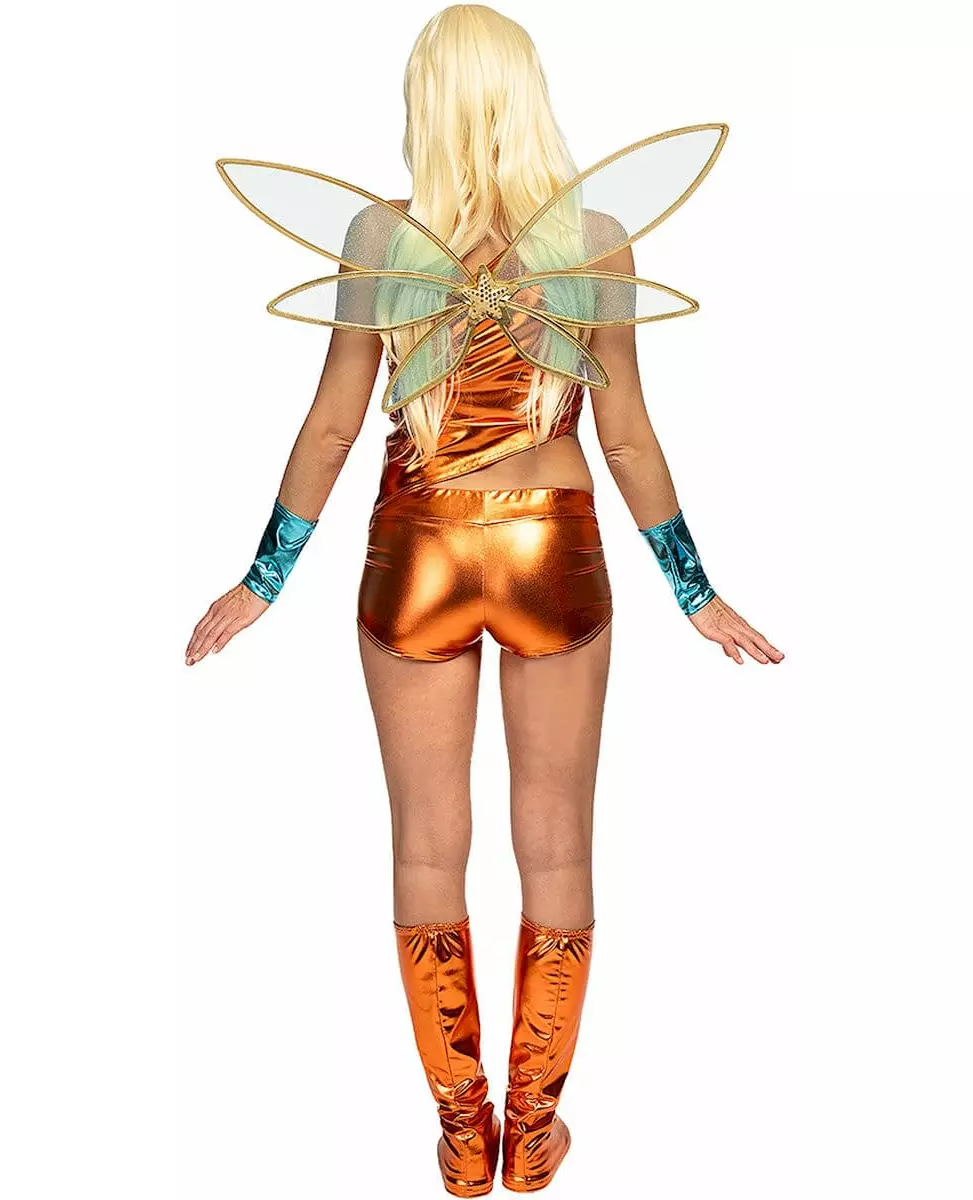 Stig inn i en magisk verden! Dykk ned i Winx™-figurenes glitrende verden med dette fantastiske offisielle Stella, sol- og månefe-kostymet! Dette offisielt lisensierte Winx™-kostymet for kvinner er designet for å fange elegansen og den lysende energien til denne strålende feen. Kostymet består av et skinnende oransje metallisk ensemble, inkludert en asymmetrisk topp og korte shorts, som perfekt reflekterer Stellas solkrefter. De metallisk blå mansjettene gir et snev av lys kontrast og ekstra dynamikk til antrekket. For å fullføre det fe-lignende utseendet pryder lysegylde vinger ryggen, som minner om feens himmelske magi. Dette kostymet er ideelt for karneval, temafester eller andre festlige arrangementer. Det lar enhver kvinne forvandle seg til den ikoniske feen Stella, full av selvtillit og sjarm. Inkludert tilbehør: 1 topp 1 par shorts 1 par mansjetter 1 par støveltrekk 1 par vinger Materiale: 100 % polyester Vedlikehold: Håndvask