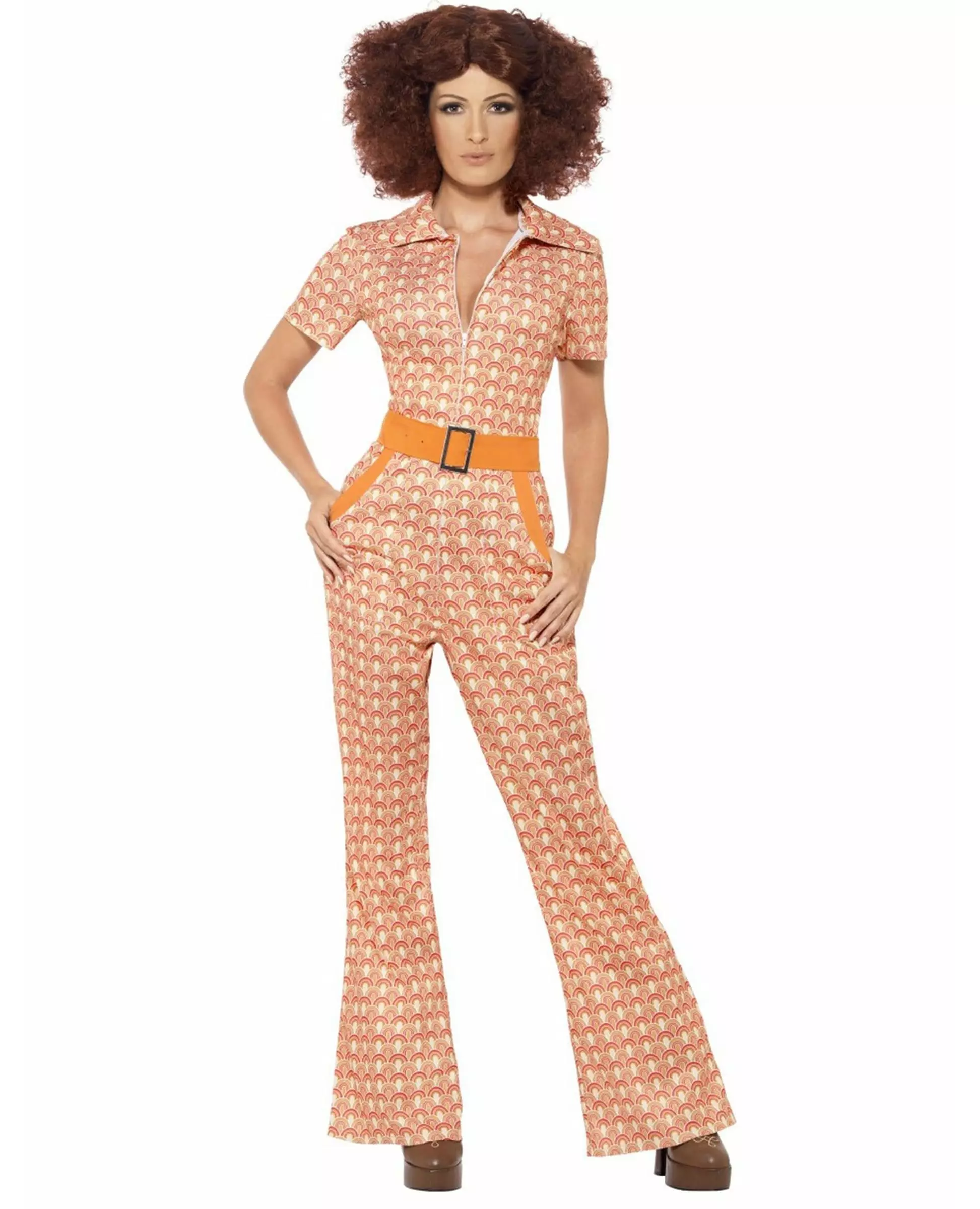 Stig inn i disco-æraen i denne fantastiske jumpsuiten. Dette elegante 70-tallskostymet for kvinner består av en jumpsuit (parykk og sko er ikke inkludert). Jumpsuiten med korte ermer er laget av et grønt, rosa og beige mønstret stoff. De har store lommer med oransje detaljer på sidene. Beina er utsvingte for å gi deg en liten disco-følelse. To store knytebånd er sydd på sidene av jumpsuiten og lukkes foran for å gi illusjonen av at du har på deg et belte. Denne jumpsuiten lukkes enkelt foran med glidelås. Dette kostymet vil være perfekt for å ta et skritt tilbake i tid til en 70-tallsfest. Inkludert tilbehør: Jumpsuit Materiale: 100 % polyester Pleie: Håndvask